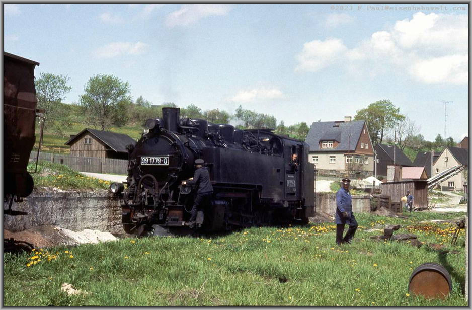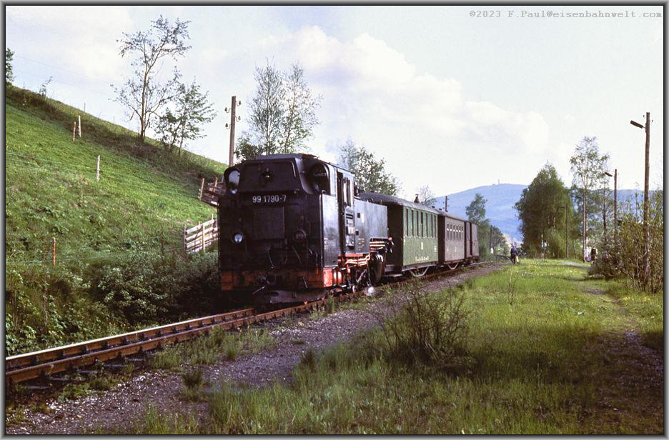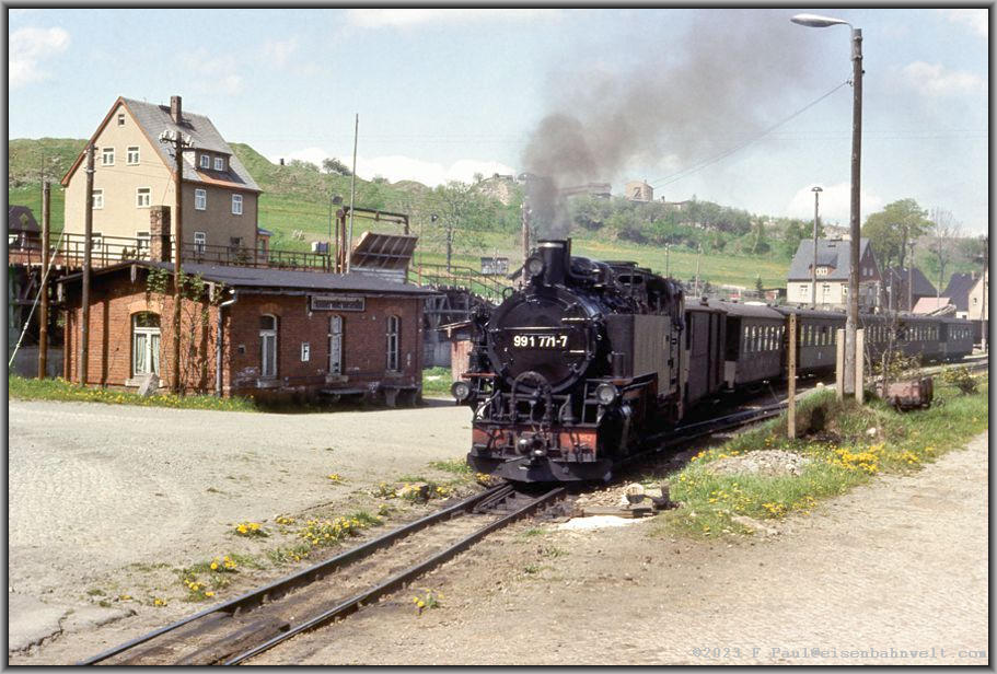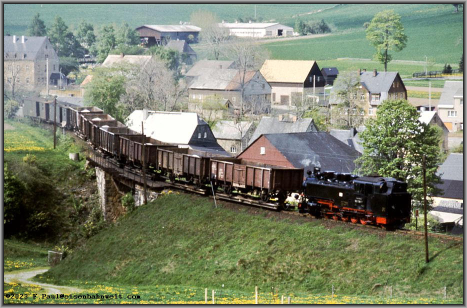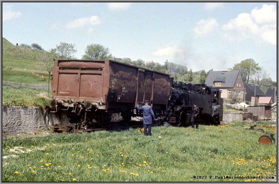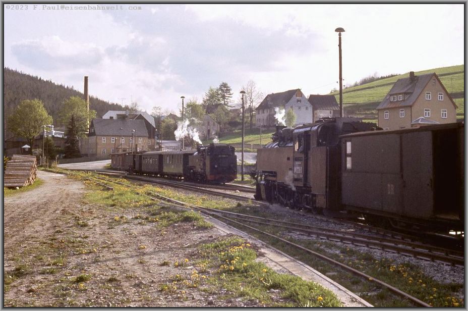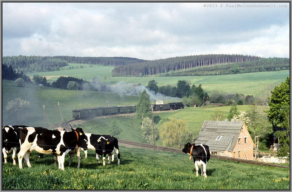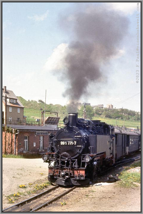 Im Mai 1983 weilte ich mit meiner Familie im Erzgebirge nahe Johanngeorgenstadt, mitten im Wald. Aber irgendwie fehlte mir da der Bahnanschluß. Auch das Wetter war schön, die Wiesen waren mit bunten Blumen übersät. Ich faßte den Entschluß, die Schmalspurbahn Cranzahl-Oberwiesenthal zu besuchen. Da die Bahnverbindungen "aus dem Wald" nach Cranzahl nicht so berauschend sind und ich am Morgen in Cranzahl eintreffen wollte, mußte ich wohl oder übel früh aufstehen..... Am Morgen des 19.05.1983 verlasse ich gegen 04:00 Uhr in der Dämmerung die Übernachtung. Eine Morgenwanderung durch Steinbach und das Steinbachtal bringt mich nach Erlabrunn. Die Sonne geht langsam über den Bergen auf, als ich dort in P 9654 einsteige. Wer denkt schon daran, für eine lumpige 110'er ein Bild zu verschwenden...? In Schwarzenberg gilt es, in P 5691 umzusteigen, der mich über den Markersbacher Viadukt nach Annaberg-Buchholz bringt. Die Fahrt über diesen Viadukt verschlafe ich allerdings.... Noch eine kurze Fahrt mit P 18747, und ich bin in Cranzahl. |