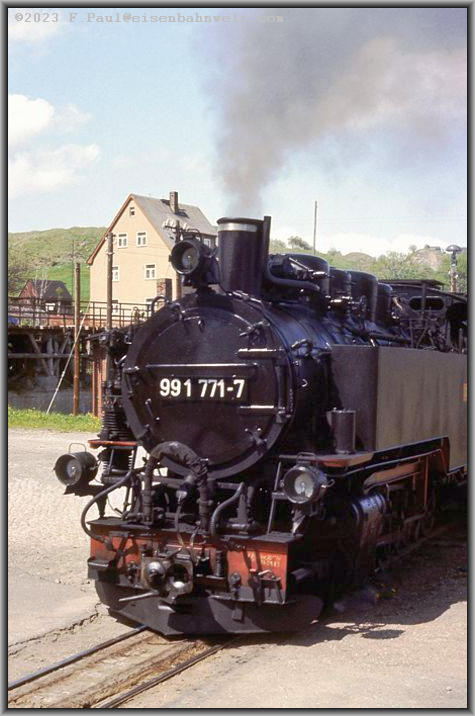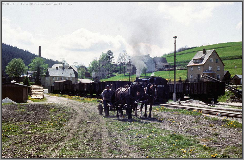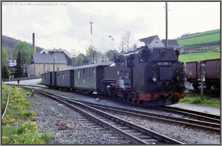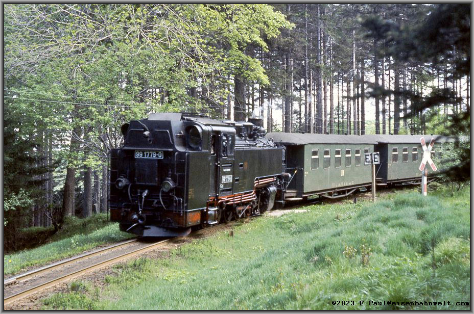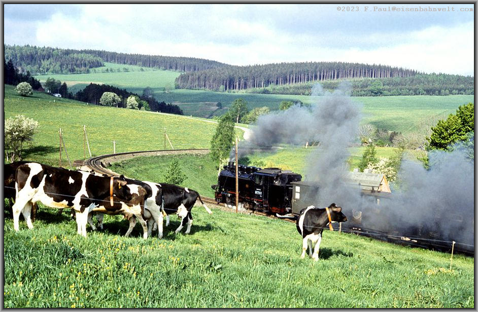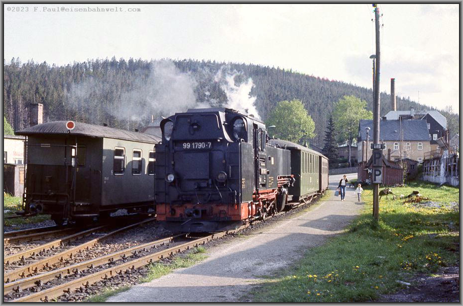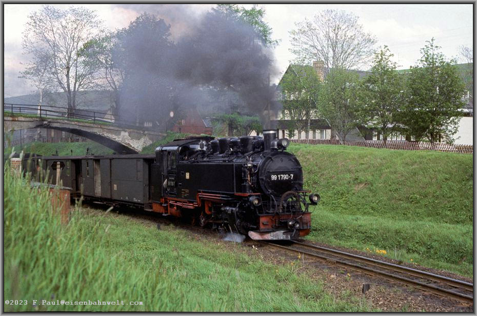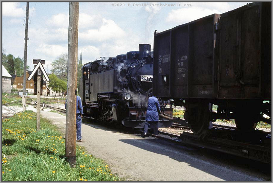Im Mai 1983 weilte ich mit meiner Familie im Erzgebirge nahe Johanngeorgenstadt, mitten im Wald. Aber irgendwie fehlte mir da der Bahnanschluß. Auch das Wetter war schön, die Wiesen waren mit bunten Blumen übersät. Ich faßte den Entschluß, die Schmalspurbahn Cranzahl-Oberwiesenthal zu besuchen. Da die Bahnverbindungen "aus dem Wald" nach Cranzahl nicht so berauschend sind und ich am Morgen in Cranzahl eintreffen wollte, mußte ich wohl oder übel früh aufstehen..... Am Morgen des 19.05.1983 verlasse ich gegen 04:00 Uhr in der Dämmerung die Übernachtung. Eine Morgenwanderung durch Steinbach und das Steinbachtal bringt mich nach Erlabrunn. Die Sonne geht langsam über den Bergen auf, als ich dort in P 9654 einsteige. Wer denkt schon daran, für eine lumpige 110'er ein Bild zu verschwenden...? In Schwarzenberg gilt es, in P 5691 umzusteigen, der mich über den Markersbacher Viadukt nach Annaberg-Buchholz bringt. Die Fahrt über diesen Viadukt verschlafe ich allerdings.... Noch eine kurze Fahrt mit P 18747, und ich bin in Cranzahl. |