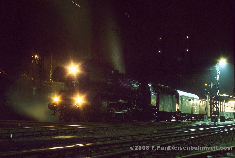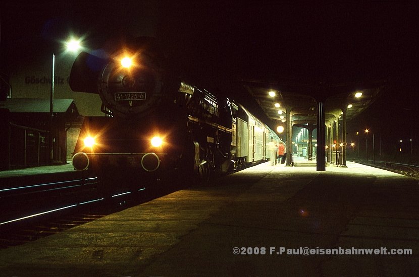 Kurz vor 22 Uhr ist es dunkel geworden, als P 5034, gezogen von 41 1225, in den Bahnhof rollt und eine (Foto-)Pause von einer Viertelstunde einlegt.