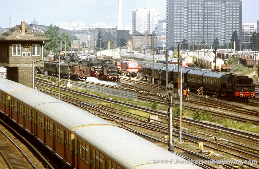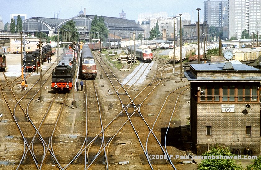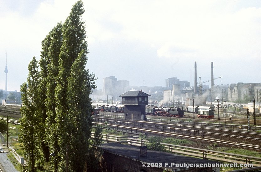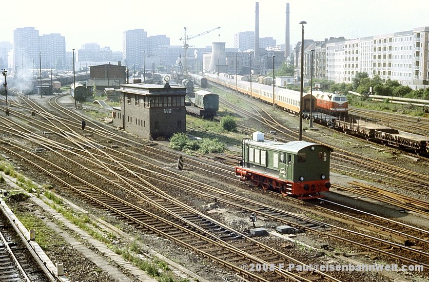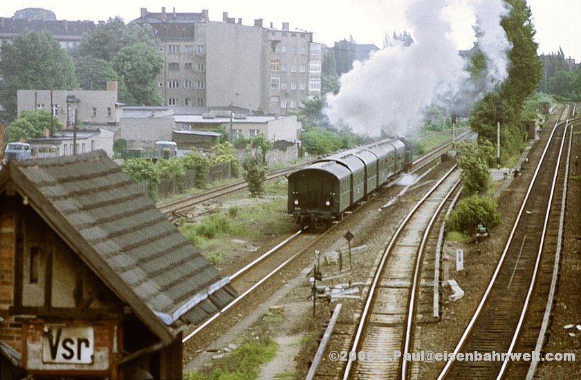 des Wriezener Gbf's, aus früheren Zeiten noch im 1000-m-Abstand zum Hauptsignal. Oben am Bahnsteig A steht ein S-Bahnzug zur Ringbahn in Richtung Blankenburg,