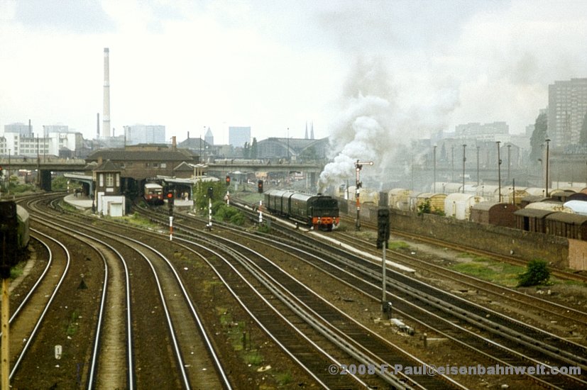 vom 1966 geschlossenen und später abgerissenen Bahnsteig B ist nur noch die kurz vor der herannahenden Lok für den ehemaligen Abgang zum Verbindungstunnel unterbrochene