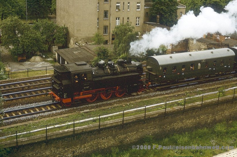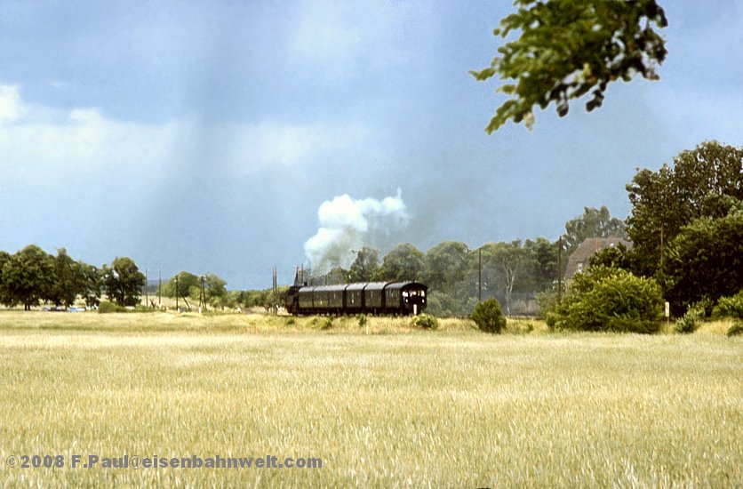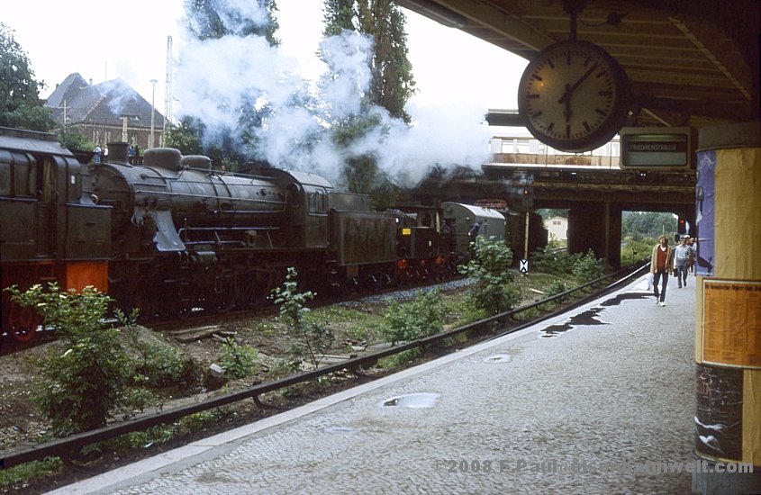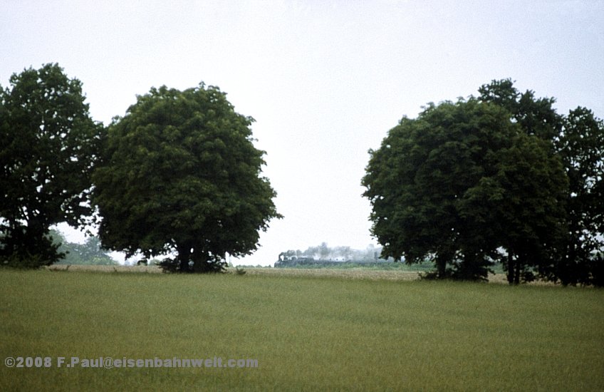 Kreuzungshalt, genügend Zeit, um über die Autobahnbrücke zur Bahnhofsausfahrt zu eilen! Im schlechten Licht dampft der Zug an mir vorbei auf dem Bahndamm in Richtung "Hauptstadt der DDR".
