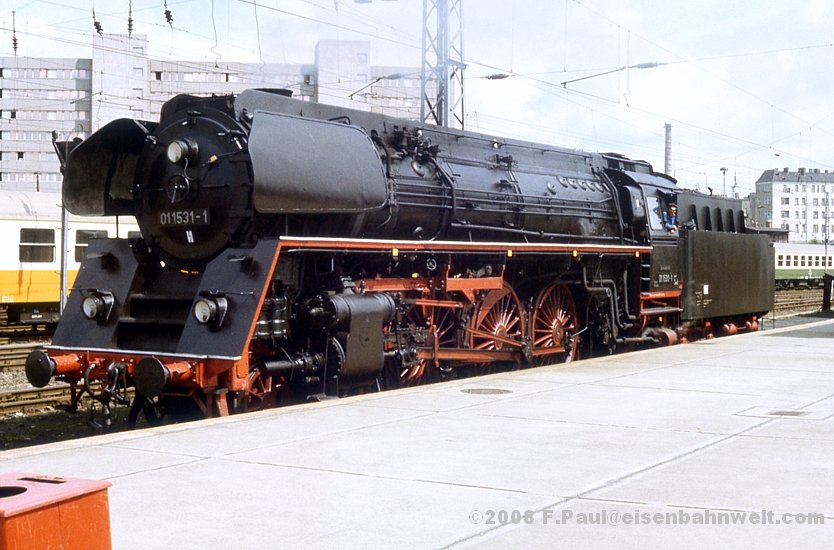 Nun aber schnell zum Bahnhof Berlin-Lichtenberg, dort hat sich 01 1531 mit dem Sonderzug D 28551 von Rostock angekündigt! Dort erfahre ich von einem Unfall in Fichtengrund, wegen dem die Strecke von Rostock total gesperrt sei. Der Sonderzug führe über Schwerin