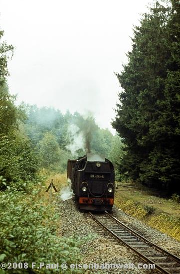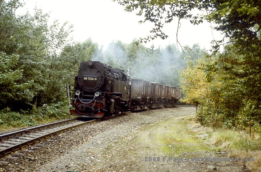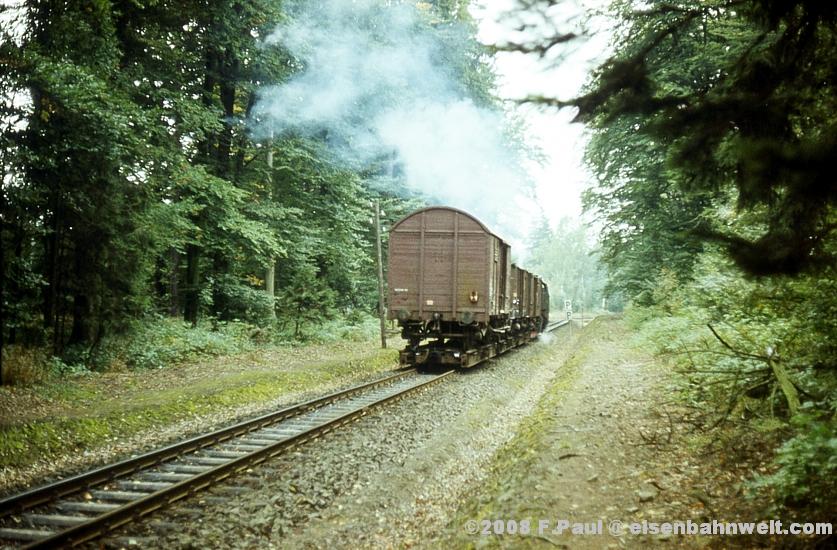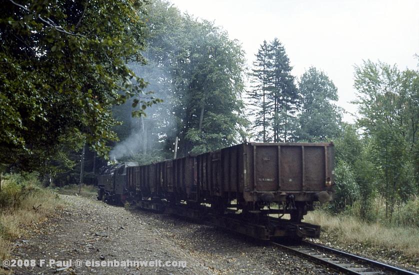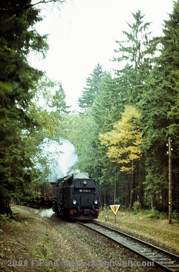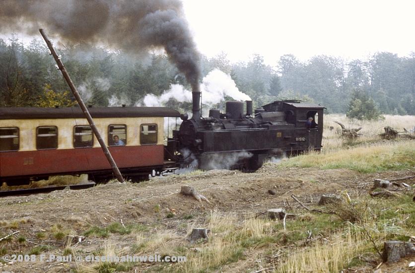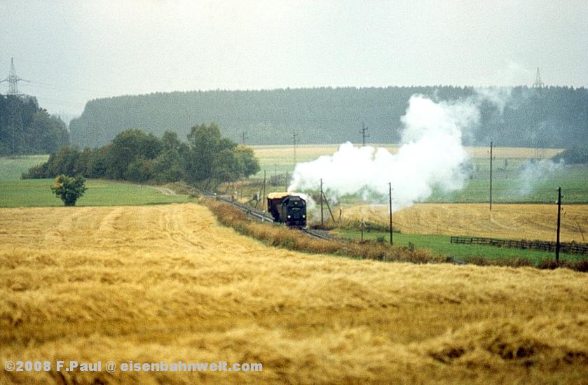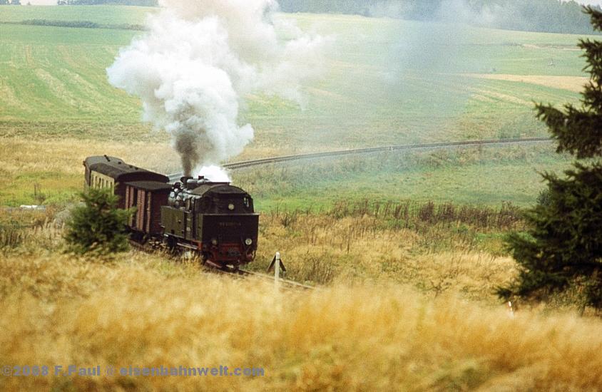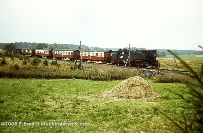 Im September 1985 vermittelte der FDGB-Feriendienst uns einen Urlaubsplatz in Stiege im Harz. Nachdem im Jahr 1983 die Verbindung zwischen Harzquer- und Selketalbahn wiedereröffnet wurde, war hier ein neuer Knotenpunkt des Harzer Schmalspurnetzes wiedererstanden, sogar mit einer wohl in Deutschland einmaligen Kehrschleife. Besonders der umfangreiche Güterverkehr zum Heizkraftwerk Silberhütte und zur Rinkemühle einerseits und nach Hasselfelde andererseits sorgte hier bis 1990 für regen Betrieb. Aber auch ein Personenverkehrs-Knoten war entstanden, hier trafen die Altbau-Dampfloks aus Gernrode auf die mit Babelsberger Neubauloks bespannten Züge aus Nordhausen. Nach einer interessanten Selketalwanderung am Vortag soll es nun am 22.09.1985 entlang der Strecke nach Eisfelder Talmühle ins Behretal gehen. Gegen 8.00 Uhr postieren wir uns am Ostkopf des Bahnhofs Stiege, um als erstes P 14461 auf Film zu bannen. Es ist ein recht grauer Morgen, zum Glück reicht das Licht inzwischen leidlich für Aufnahmen in der freien Landschaft. |