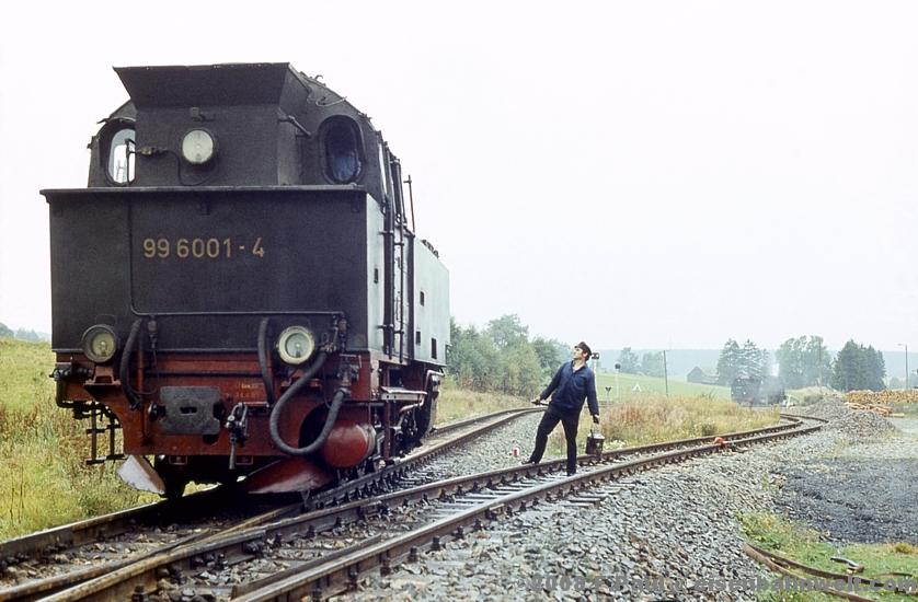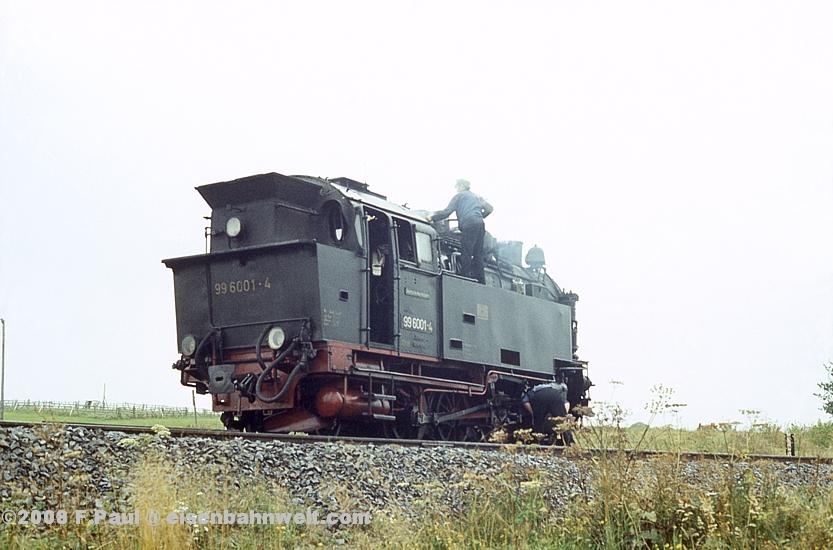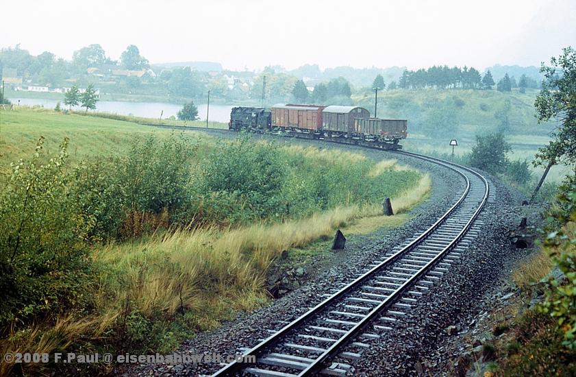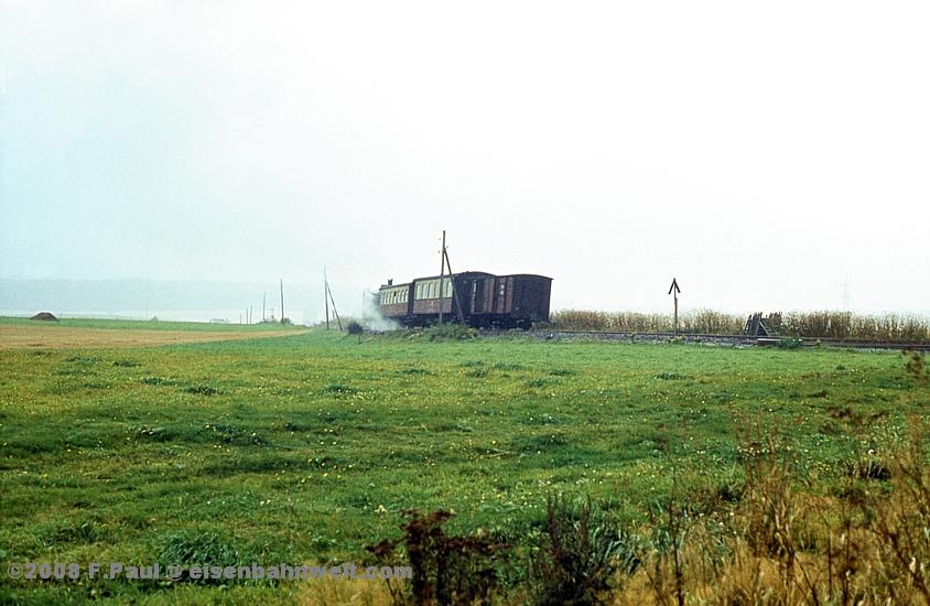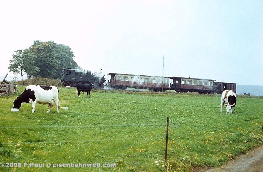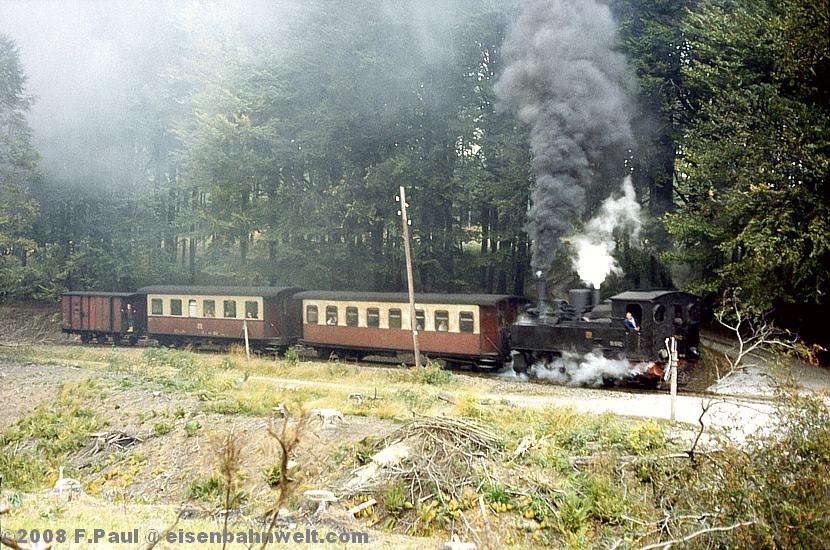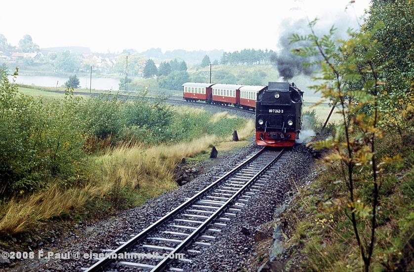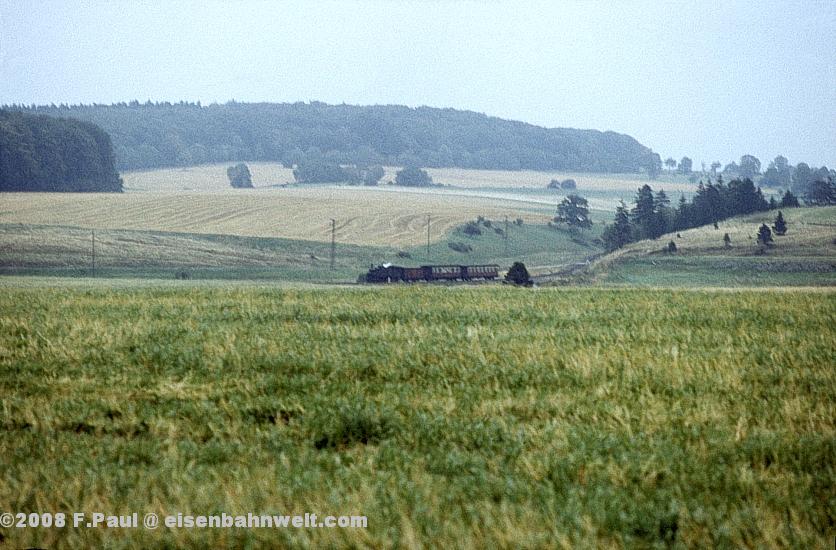 Im September 1985 vermittelte der FDGB-Feriendienst uns einen Urlaubsplatz in Stiege im Harz. Nachdem im Jahr 1983 die Verbindung zwischen Harzquer- und Selketalbahn wiedereröffnet wurde, war hier ein neuer Knotenpunkt des Harzer Schmalspurnetzes wiedererstanden, sogar mit einer wohl in Deutschland einmaligen Kehrschleife. Besonders der umfangreiche Güterverkehr zum Heizkraftwerk Silberhütte und zur Rinkemühle einerseits und nach Hasselfelde andererseits sorgte hier bis 1990 für regen Betrieb. Aber auch ein Personenverkehrs-Knoten war entstanden, hier trafen die Altbau-Dampfloks aus Gernrode auf die mit Babelsberger Neubauloks bespannten Züge aus Nordhausen. Nach einer interessanten Selketalwanderung am Vortag soll es nun am 22.09.1985 entlang der Strecke nach Eisfelder Talmühle ins Behretal gehen. Gegen 8.00 Uhr postieren wir uns am Ostkopf des Bahnhofs Stiege, um als erstes P 14461 auf Film zu bannen. Es ist ein recht grauer Morgen, zum Glück reicht das Licht inzwischen leidlich für Aufnahmen in der freien Landschaft. |