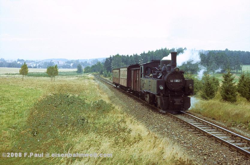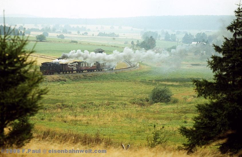 Mit wenigen Minuten Verspätung rollt der Personenzug mit seinen 3 Wagen, der Regelzugbildung der von Gernrode aus verkehrenden Züge, über die Hochfläche auf den Bahnhof Stiege zu, heute bespannt mit der Malletlok 99 5902. und, nach kurzer Zeit, die Kehrschleife in Stiege ist durchfahren, nimmt die Lok die letzte Steigung zum Brechpunkt bei Birkenmoor in Angriff. Ab da geht es dann nur noch bergab bis Eisfelder Talmühle, dem Endpunkt des immerhin 44 Kilometer langen Zuglaufes. |
