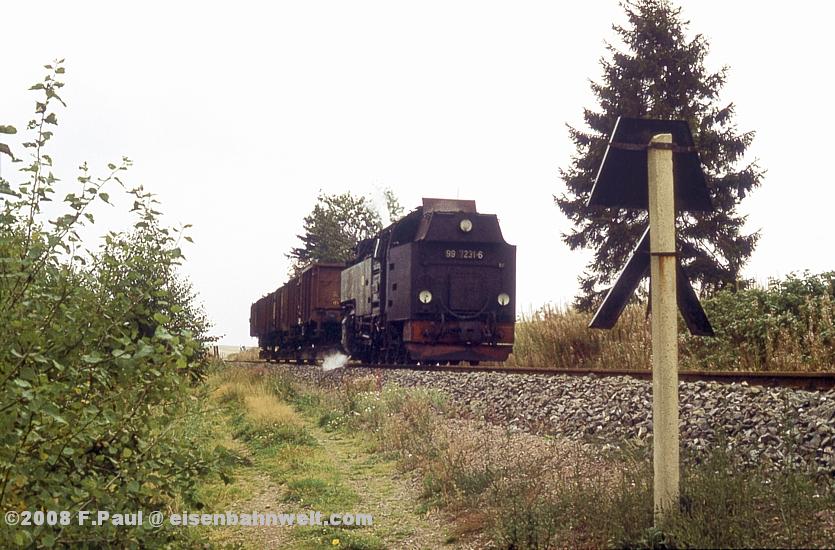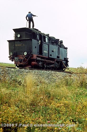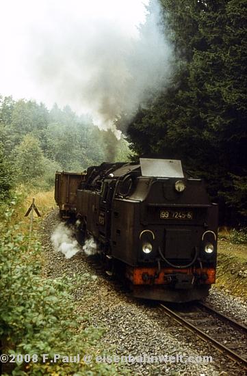Die Abfahrtszeit des Personenzuges kommt heran, aber nichts passiert! Und plötzlich: Kleiner Tip, schau doch mal in die andere Richtung! Still und leise rollt 99 7231 mit Ng 67093 aus Silberhütte in den Bahnhof, eine knappe Stunde zu früh! Na, da haben wir ja noch fünf Minuten Zeit, auf den naheliegenden Hügel zu rennen! Das müßte von dort aus doch ein schönes Panorama-Bild von P 14464 geben..... |