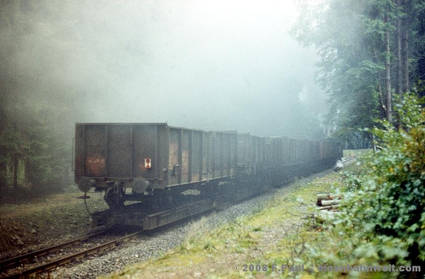Leider zu früh rollt 99 7234 mit dem Gegenzug von Hasselfelde, Ng 67075, an uns vorbei (links). Am Lf 1-Signal wird schon kein Dampf mehr gebraucht, da es jetzt in Kürze sowieso bergab in das Behretal geht. Gemächlich rumpelt die Fuhre an uns vorbei, als vierter Wagen fand sich in Hasselfelde noch ein gedeckter mit Tonnendach (oben). Was nun? Ein banger Blick geht in Richtung der im Nebel liegenden Wolkendecke, aus der inzwischen leichter, aber durchdringender, Nieselregen rinnt, unsere Kleidung zu durchnässen. Wir entschließen uns aus diesem Grund, nach Stiege zurückzukehren, und laufen längs des Gleises zurück, nicht ohne noch an einer geeigneten Stelle auf den Frühzug von Silberhütte zu warten... |