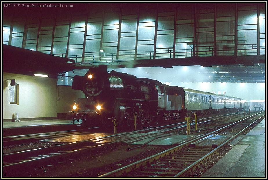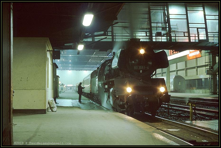 Unter der durch die Bahnhofshalle tönenden Stimme des Ansagers schiebt 50 3551 gegen 07:00 Uhr langsam die Rekowagen in Richtung Prellbock,