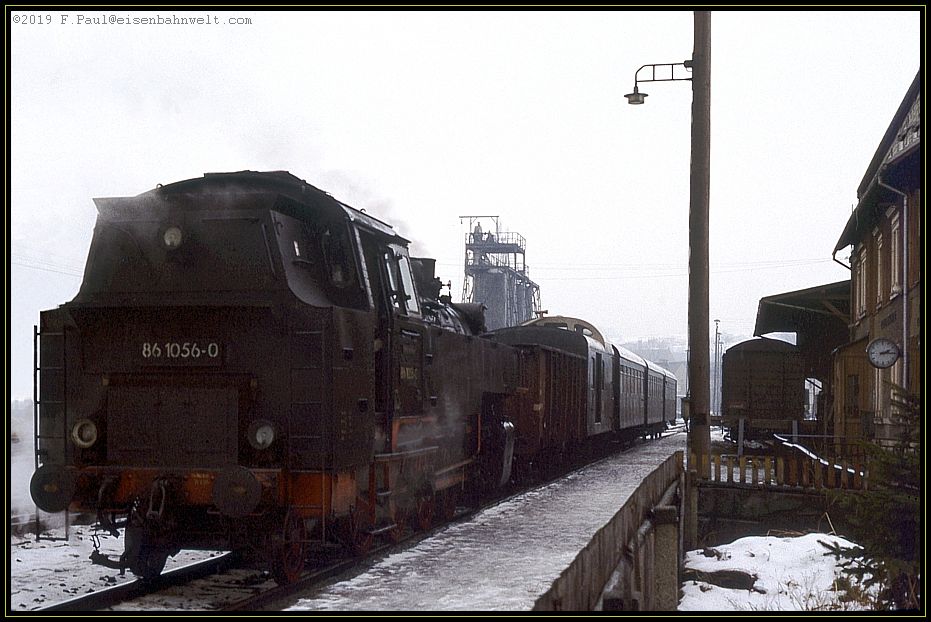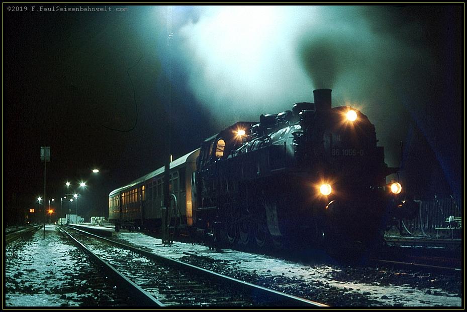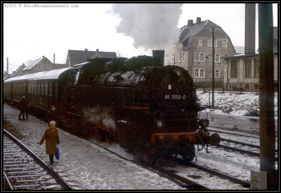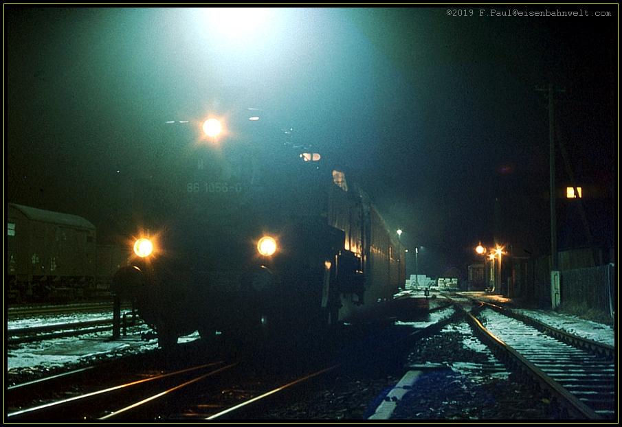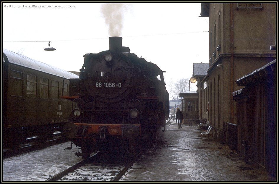 und wir postieren uns rechtzeitig in der Bahnhofseinfahrt von Walthersdorf, wo pünktlich um 13.18 Uhr die Fuhre heranrollt: 86 1056, 3"Donnerbüchsen",