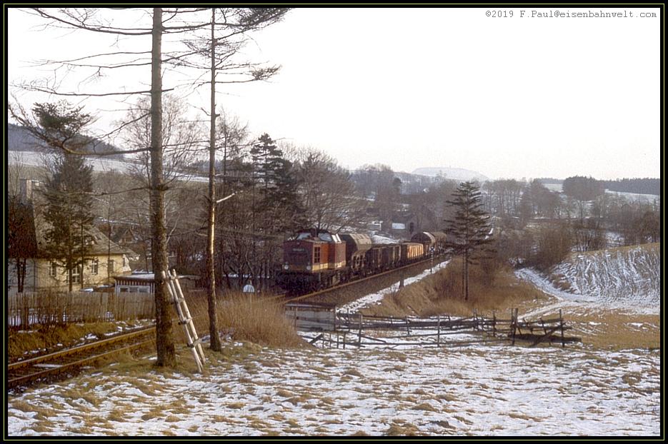 unerkannt gebliebene 110'er mit Ng 61968 von Annaberg-Buchholz heran, diese wird in Schlettau auf die Wagen aus dem Gmp 68364 von Crottendorf