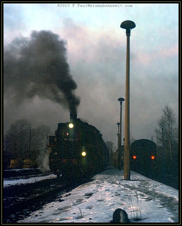 warten müssen, welcher dann auch kurze Zeit später herandampft. Diesmal hängen ein paar mehr Wagen am Haken der schwer arbeitenden 86'er. Und die