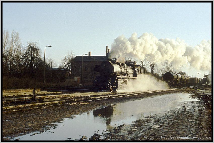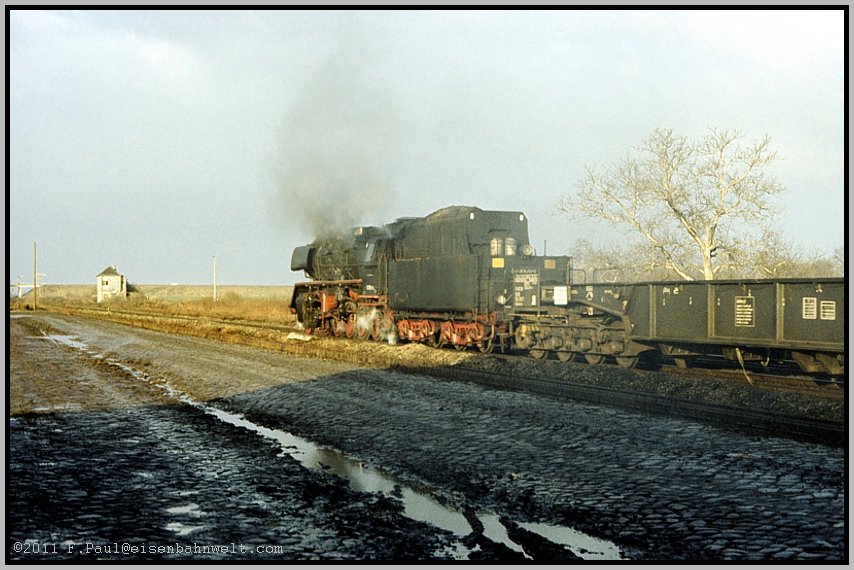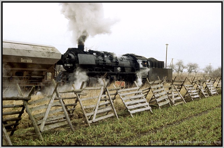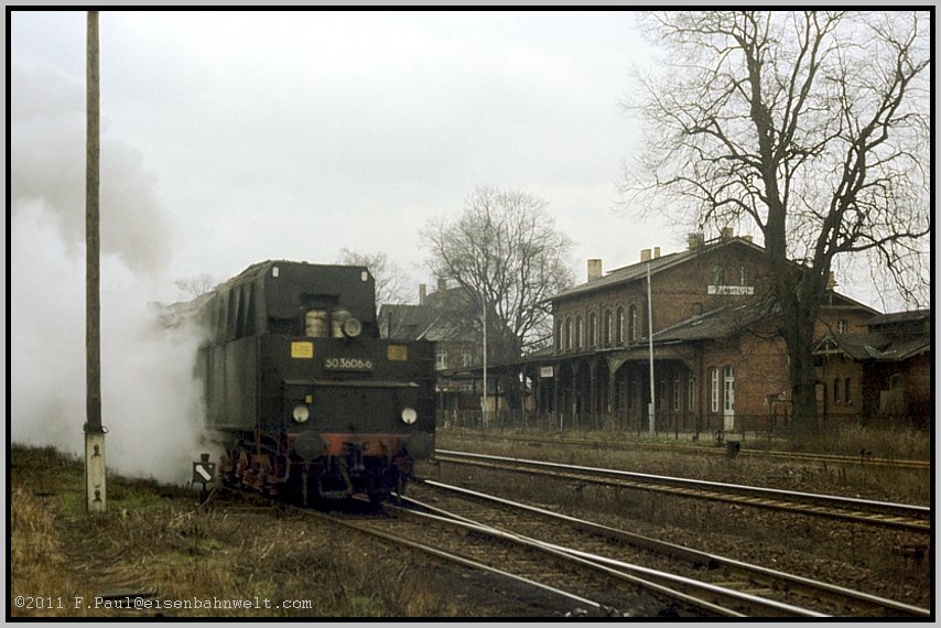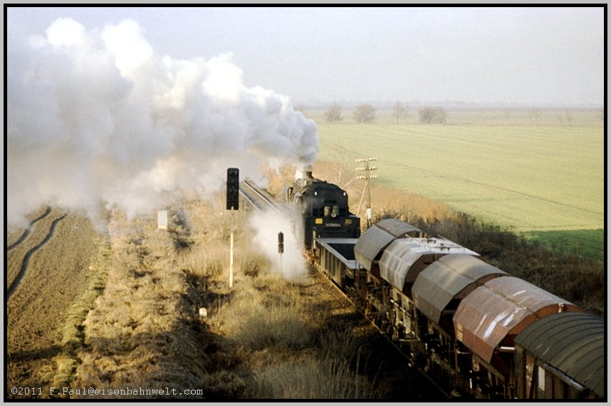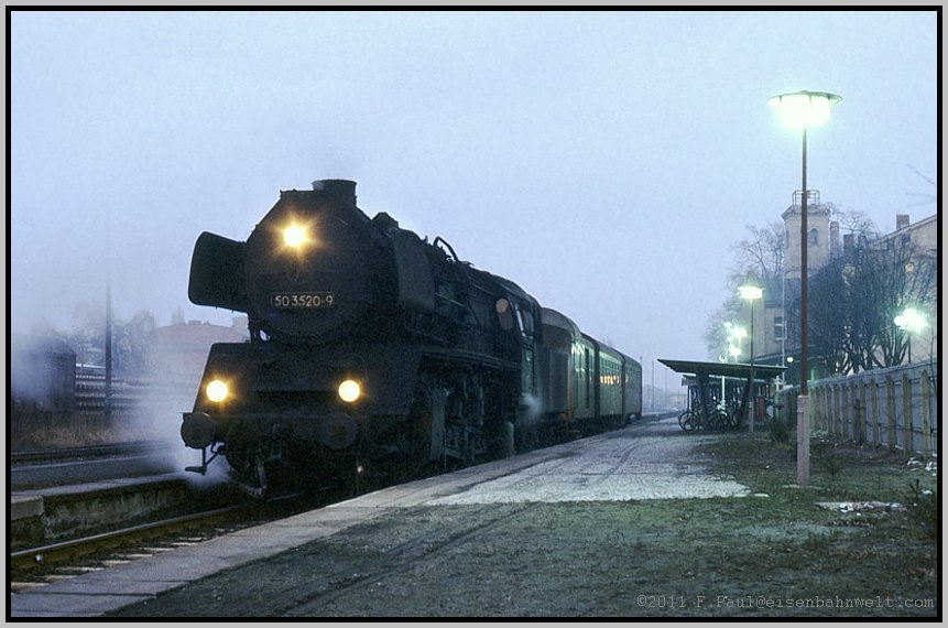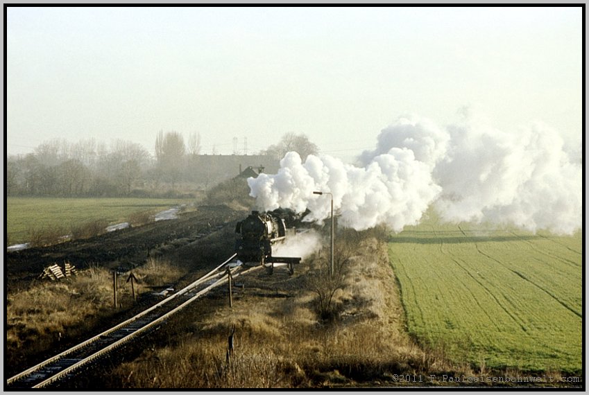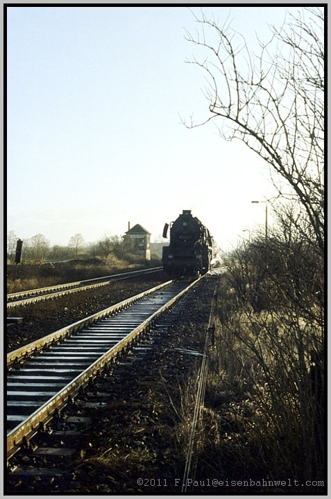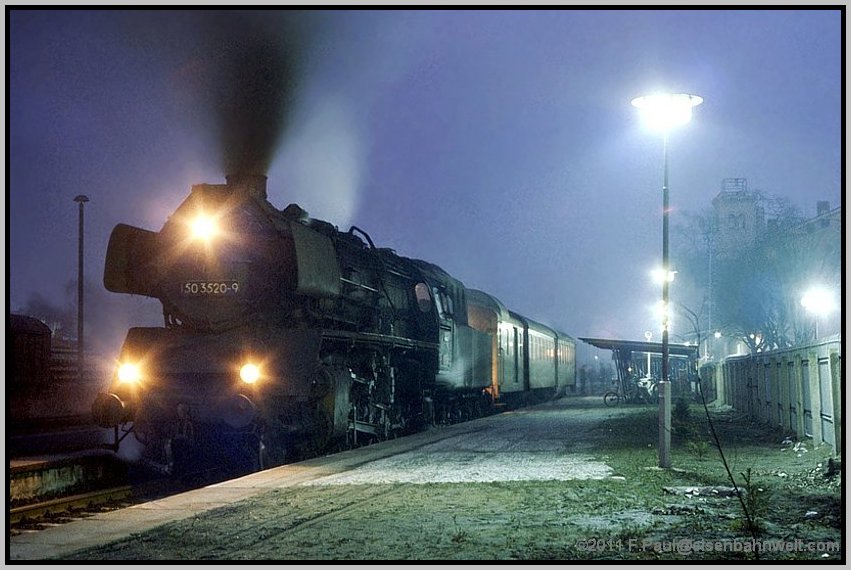 Im Februar 1988 gab es wenig winterliche Temperaturen. Was tun? Dem Wetterbericht vertrauen, der für den 22.02.1988 wenigstens etwas Sonne versprochen hat, obwohl es am Vortag wie aus Eimern goß? Und dem Halberstädter Lokleiter, welcher telefonisch versichert, daß an diesem Tag noch 3 Oscherslebener 50'er im Einsatz seien? Wieder einmal stehe ich am Abend des 21.02.1988 auf dem zugigen Bahnsteig von Berlin-Schöneweide und warte auf die Bereitstellung des D 648, welche, wie eigentlich immer, "auf den letzten Drücker" erfolgt. Die Reisenden an diesem Sonntagabend, Pendler, Lehrlinge und Studenten, sind mobil und schnell genug, den Zug trotzdem pünktlich um 21.56 Uhr abfahren zu lassen. Und pünktlich sind wir auch in Burg (b Magdeburg), wo ich schon bei einem Eisenbahnfreund angemeldet bin, die kurze Nacht dort zu verbringen - und nicht auf dem Magdeburger Hbf. Und kurz ist diese Nacht, um 04.00 Uhr eile ich schon wieder durch die menschenleeren Straßen von Burg zum Bahnhof, motiviert durch einen Blick zum sternenübersäten Himmel! Nun, P 7402 bringt mich nach Magdeburg zum Umstieg auf P 8446, der mich bis 07.05 Uhr nach Langenweddingen bringt. Da hat die Dämmerung schon eingesetzt und der Sternenhimmel ist verblaßt. |