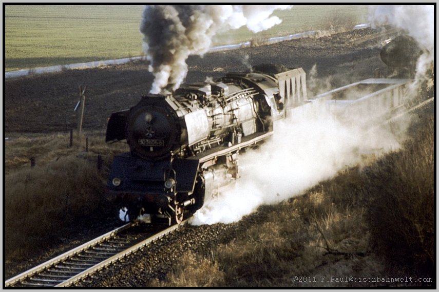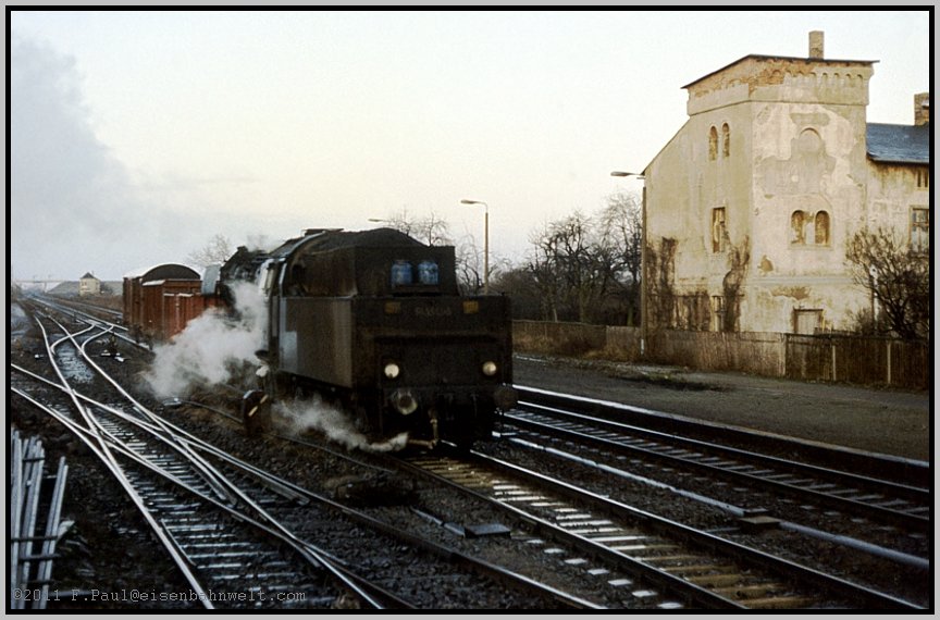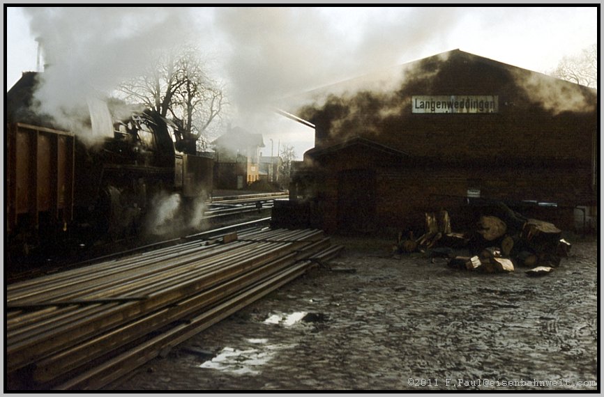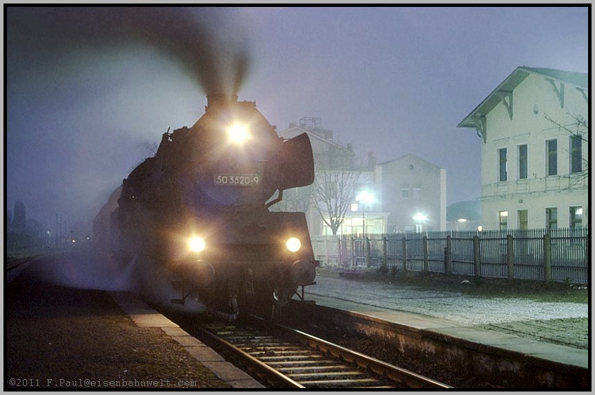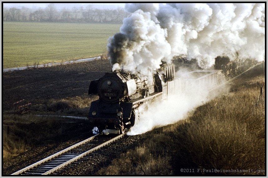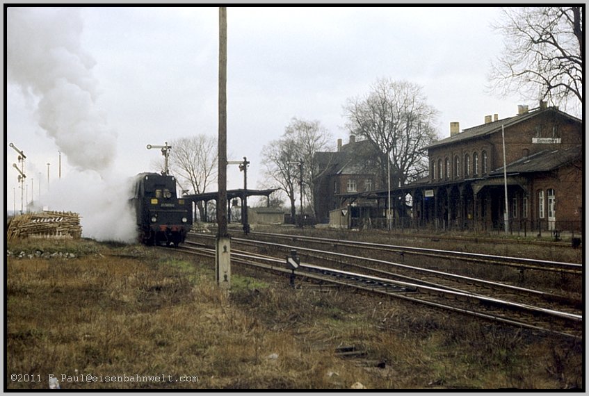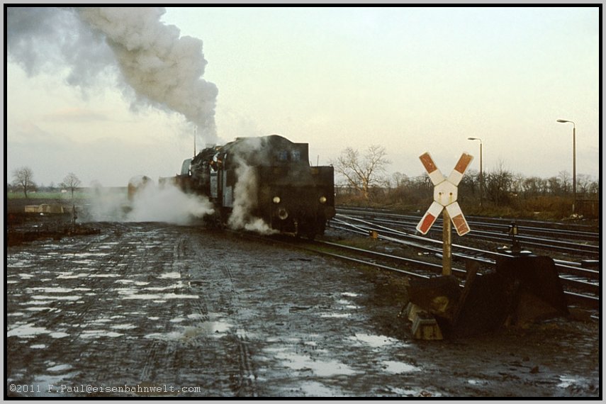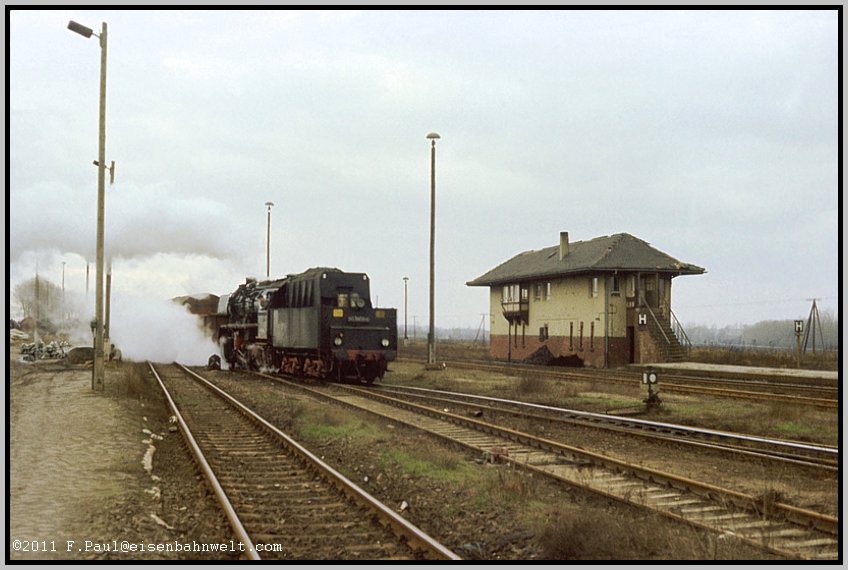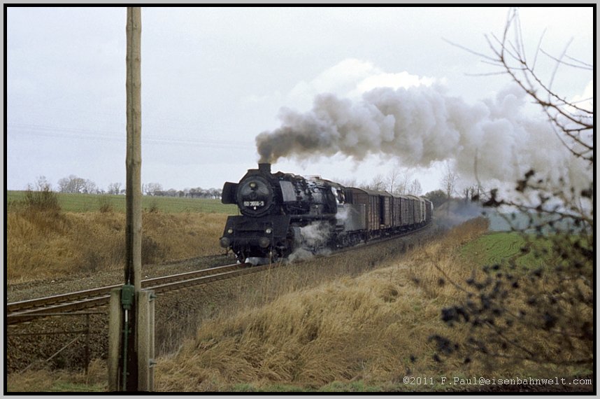 Im Februar 1988 gab es wenig winterliche Temperaturen. Was tun? Dem Wetterbericht vertrauen, der für den 22.02.1988 wenigstens etwas Sonne versprochen hat, obwohl es am Vortag wie aus Eimern goß? Und dem Halberstädter Lokleiter, welcher telefonisch versichert, daß an diesem Tag noch 3 Oscherslebener 50'er im Einsatz seien? Wieder einmal stehe ich am Abend des 21.02.1988 auf dem zugigen Bahnsteig von Berlin-Schöneweide und warte auf die Bereitstellung des D 648, welche, wie eigentlich immer, "auf den letzten Drücker" erfolgt. Die Reisenden an diesem Sonntagabend, Pendler, Lehrlinge und Studenten, sind mobil und schnell genug, den Zug trotzdem pünktlich um 21.56 Uhr abfahren zu lassen. Und pünktlich sind wir auch in Burg (b Magdeburg), wo ich schon bei einem Eisenbahnfreund angemeldet bin, die kurze Nacht dort zu verbringen - und nicht auf dem Magdeburger Hbf. Und kurz ist diese Nacht, um 04.00 Uhr eile ich schon wieder durch die menschenleeren Straßen von Burg zum Bahnhof, motiviert durch einen Blick zum sternenübersäten Himmel! Nun, P 7402 bringt mich nach Magdeburg zum Umstieg auf P 8446, der mich bis 07.05 Uhr nach Langenweddingen bringt. Da hat die Dämmerung schon eingesetzt und der Sternenhimmel ist verblaßt. |