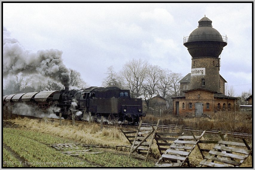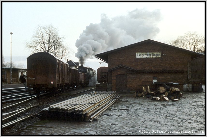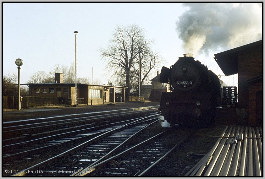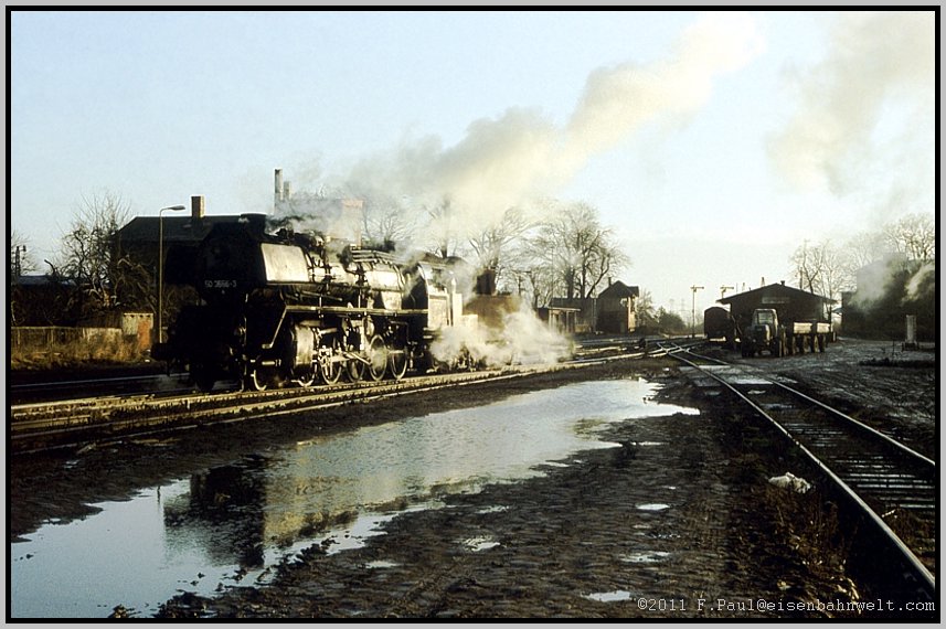 Erste Sonnenstrahlen beleuchten die alte Wasserstation, als 50 3556 mit dem aus drei Wagen bestehenden Ng 64773 in das Überholgleis des Bahnhofs rollt. Nur kurz ist der Aufenthalt, hurtig rangiert die Lok in die von der pfützenübersäumten Ladestraße umgebenen Nebengleise, schnell sind zwei Wagen abgekuppelt und ebenso schnell dampft die Maschine weiter mit dem letzten Wagen nach Dodendorf. Ich kann nur noch hinterherschauen, |