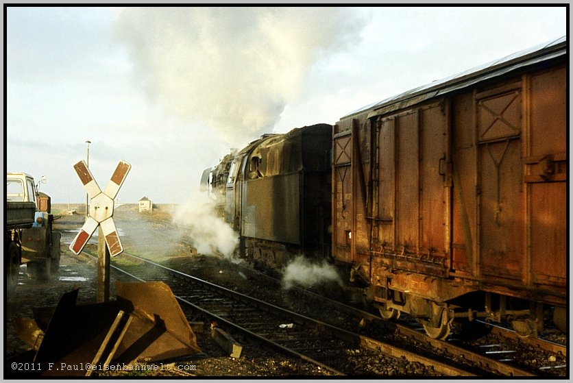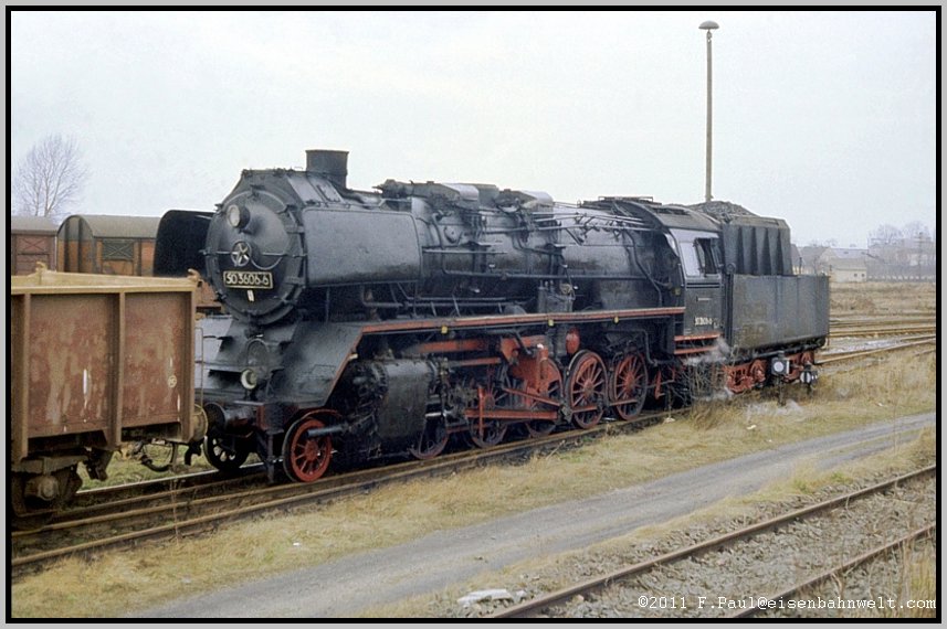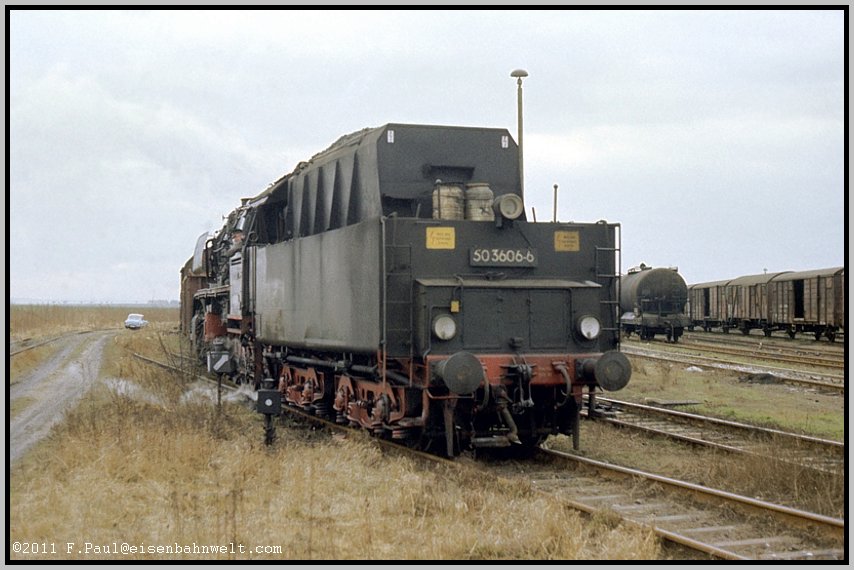 Aber bald tauchen am Horizont erneut Qualmwolken auf und kurz darauf rollt 50 3606 mit Ng 61744 in das Überholgleis des Bahnhofs. Der Zug ist planmäßig und kreuzt hier mit P 8447. Leider verhindert eine Westwind-Böe das Spiegeln der einfahrenden Lok in der dazu eigens ausgesuchten größten Pfütze auf der Ladestraße. Hinter der Lok läuft übrigens ein leerer Schwerlast-Transportwagen, u.a. zum Transport von Transformatoren benutzt. |