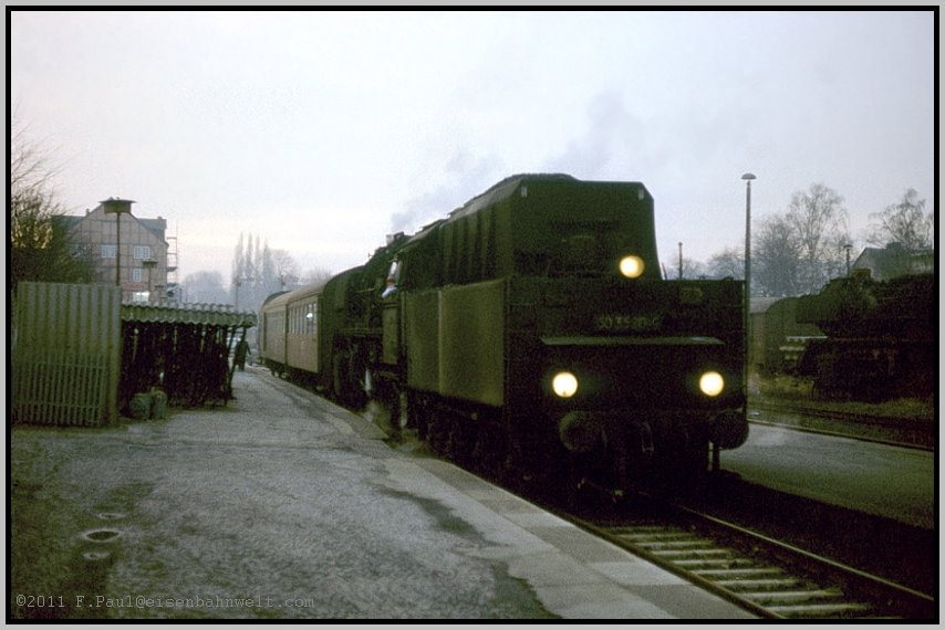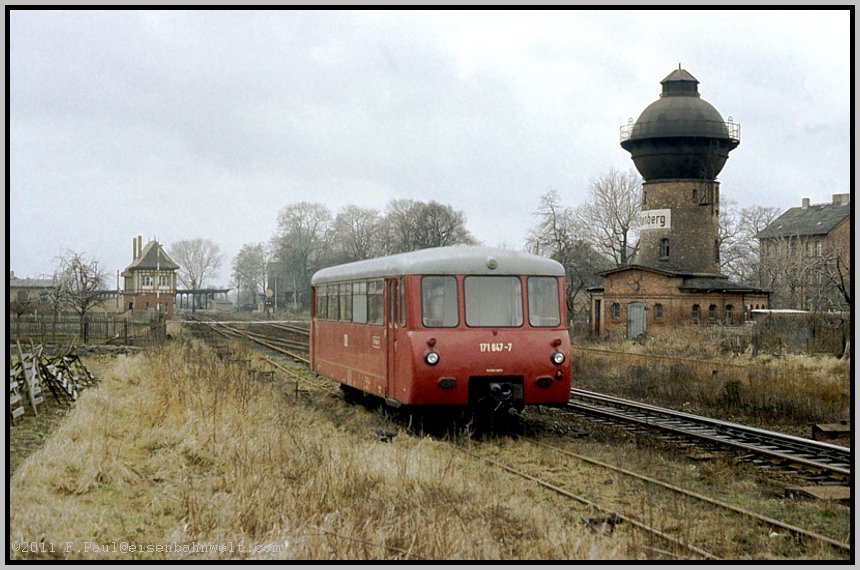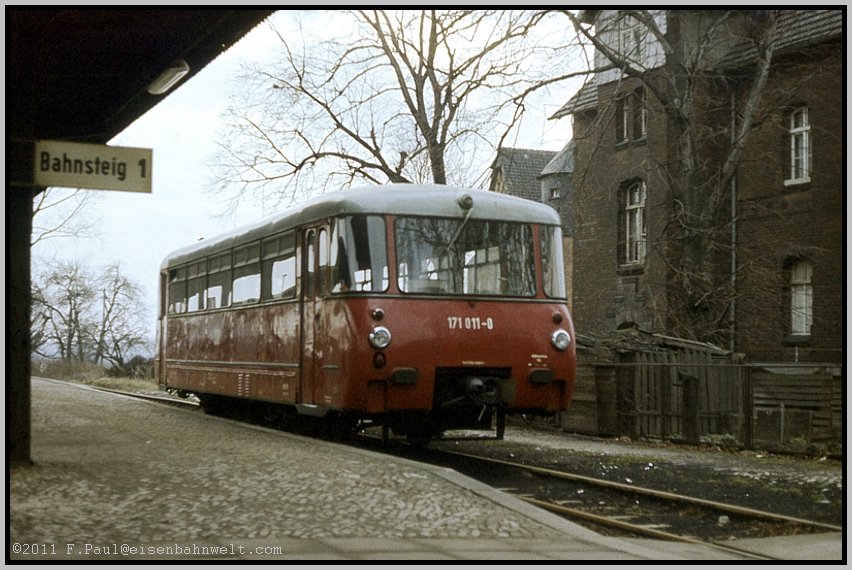 Langsam wird es nun dunkel. Ich wechsle hinüber zum Bahnsteig 2, um mit P 8454 nach Oschersleben zu fahren. Kurz vorher rollt 171 011 aus Eilsleben nach Bahnsteig 1, P 18479 ist ohne Fahrgäste. Schnell schließt der Fahrer ab und verschwindet im Bahnhofsgebäude, um dort die knappe Stunde bis zur Rückfahrt nach Eilsleben zu überbrücken. 5 Minuten später fährt dann auch mein Zug ein und bringt mich nach Oschersleben, wo ich um 17.14 Uhr eintreffe. Hier müßte in zwanzig Minuten die dritte Oscherslebener 50'er aus Gunsleben zurückkehren. |