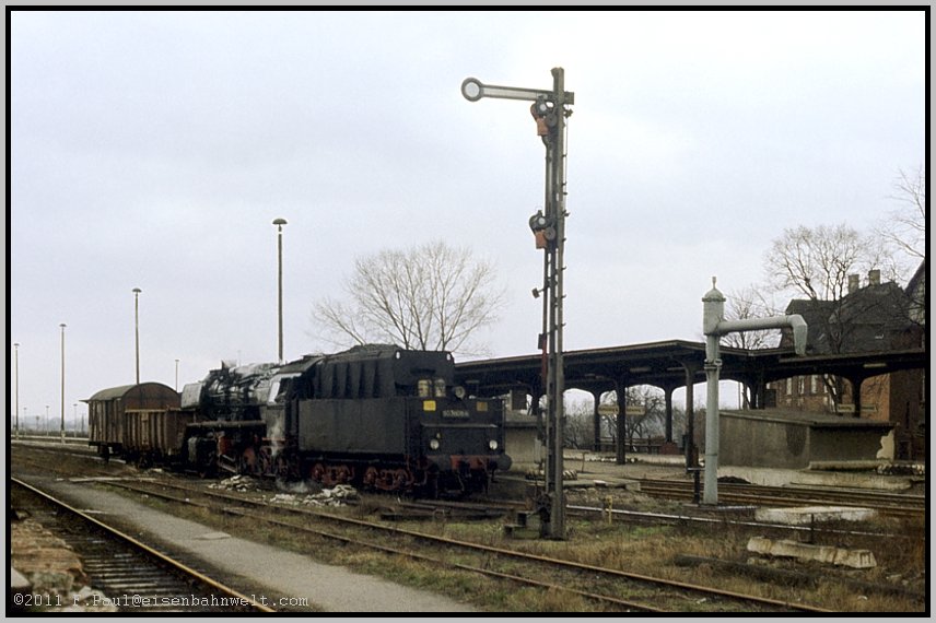 50 3606 ist da, hat fertig rangiert und wartet auf Ausfahrt! Wann ist sie gekommen, daß sie mir durch die Lappen gegangen ist? Aber keine Zeit für Nachforschungen, denn nun fährt sie schon ab, arbeitet sich knarzend und quietschend aus dem Güterbahnhof in das zugleich als Bahnsteiggleis 6 dienende Ausfahrgleis vor, kommt aber am geschlossenen Ausfahrsignal C erst einmal zum Halten. P 8453 hat Verspätung, so daß auch noch D 647 mit seiner heulenden Ludmilla vorgelassen werden muß, bis die Strecke für Ng 64775 nach Dodendorf frei ist. Bei zwei Wagen Zugumfang ist natürlich keine besonders eindrucksvolle Abfahrt zu erwarten, der Dampf dient auch mehr zum Anwärmen der Zylinder, als die Fuhre am eindrucksvollen Empfangsgebäude vorbei auf die Strecke zieht. |