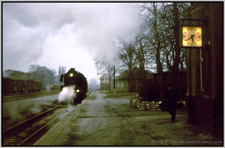 Da steht sie nun, die Dampflok, bereit zur letzten Fahrt des Tages nach Gunsleben mit Gmp 68728, heute ohne Güterwagen, mit einer Fahrzeit von 41 Minuten für die 14,3 Kilometer auf einer Strecke, welche wie manch andere durch die deutsche Teilung entstandene Stichbahn hüben wie drüben mehr oder weniger aus politischen Gründen am Leben erhalten wurde und nach der sich anbahnenden Wende keine Chance auf Fortbestand mehr haben wird. Die drei auf dem letzten Bild schemenhaft erkennbaren Personen sind wohl eher Eisenbahner und nicht Reisende mit Berechtigung zur Fahrt ins Grenzgebiet..... |