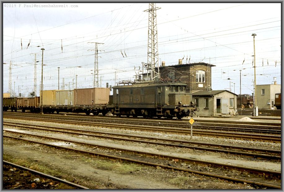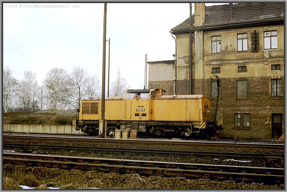 Auf der anderen seite der Bahnanlagen geht es nun zurück nach Westen und wir passieren das Stellwerk W 11 mit der wartenden 111 023 im Vordergrund.