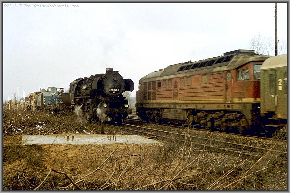 hier auf dem Weg zur L 6-Untersuchung in Görlitz Zwischenstation. Auf der anderen Seite des Güterbahnhofs dampft es dagegen, 52 8044 hat ihren Betonmischzug dorthin