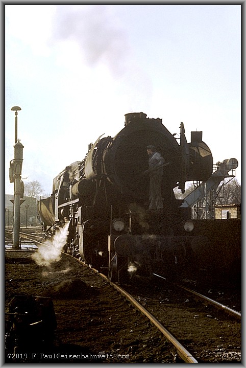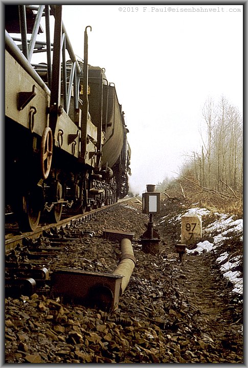 hier angeordneten Schlackesumpf. Mehr Zeit benötigt jedoch das Wassernehmen. Zeit genug noch für ein Stilleben mit Windleitblechen, einigen Rangiersignalen und einem Formhauptsignal,
