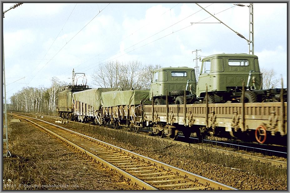 Die Frachten hinter der Lokomotive entpuppen sich als Militärgut. Und was sich wohl unter den Planen verbirgt? Ein ordentlicher, bunt gemischter Dg rumpelt an uns vorbei,
