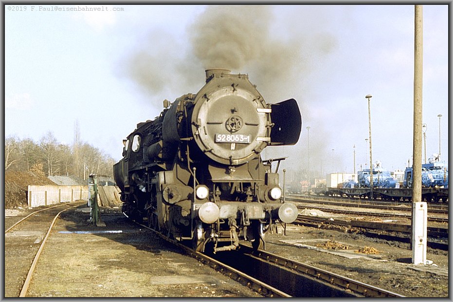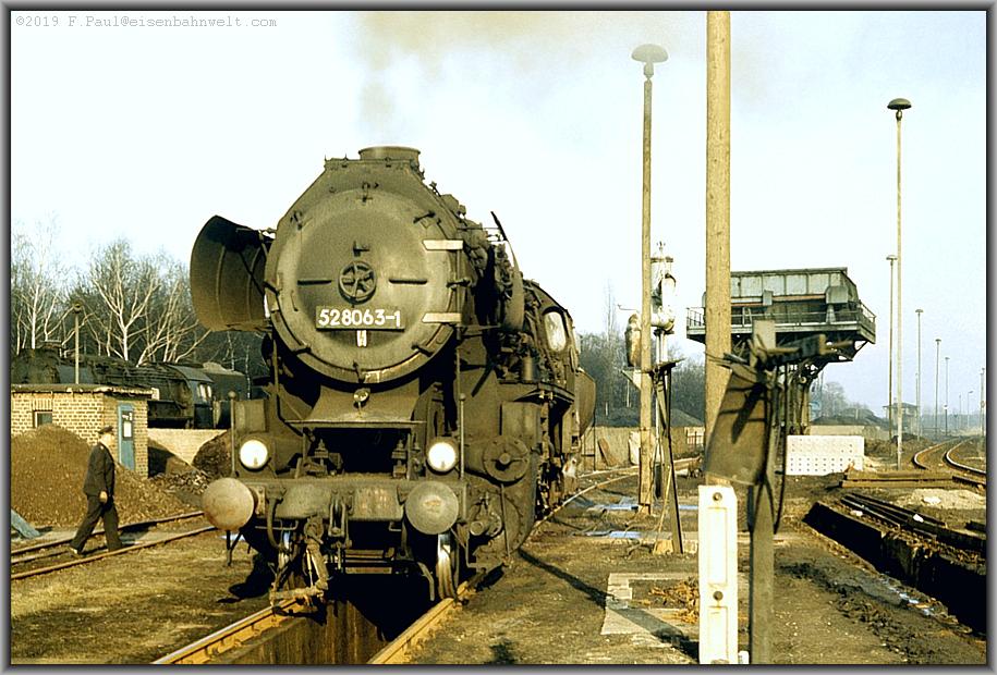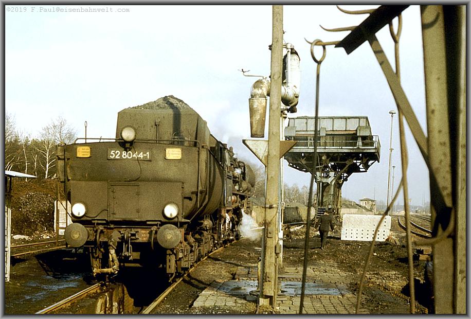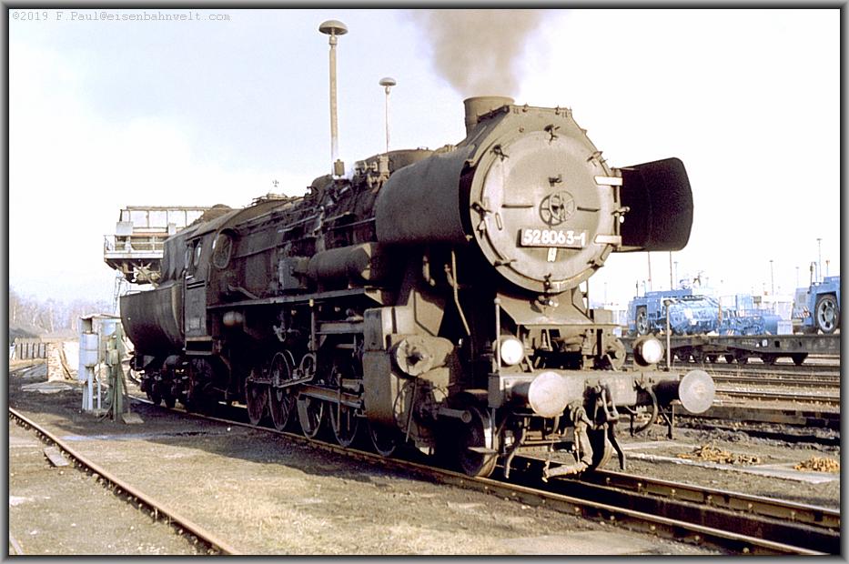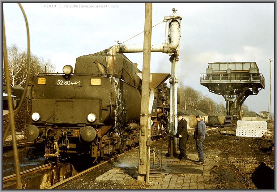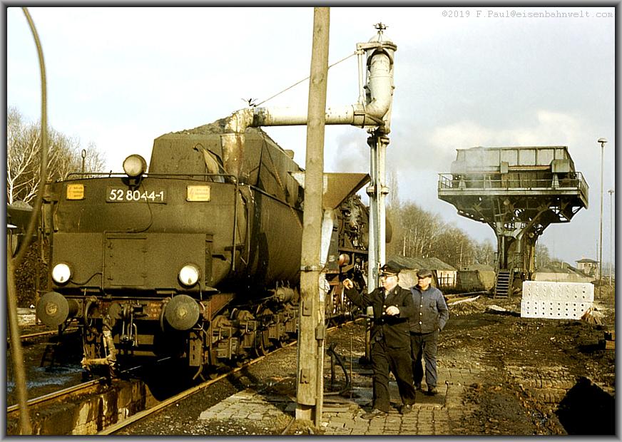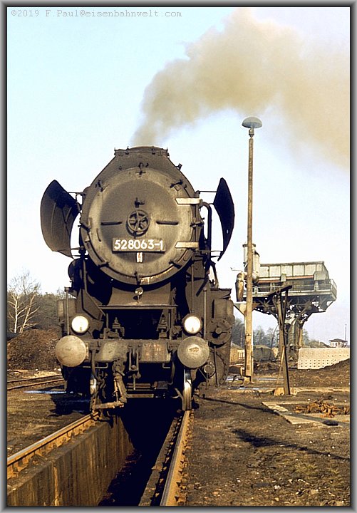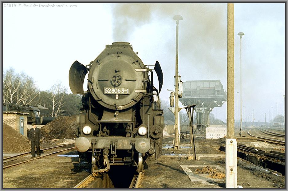 Später kehrt auch 52 8063 von ihrem Betonmischzug-Einsatz zum Restaurieren in das Bw Falkenberg (Elster) zurück. Zuerst geht es zum Kohlenbansen, Brennstoff