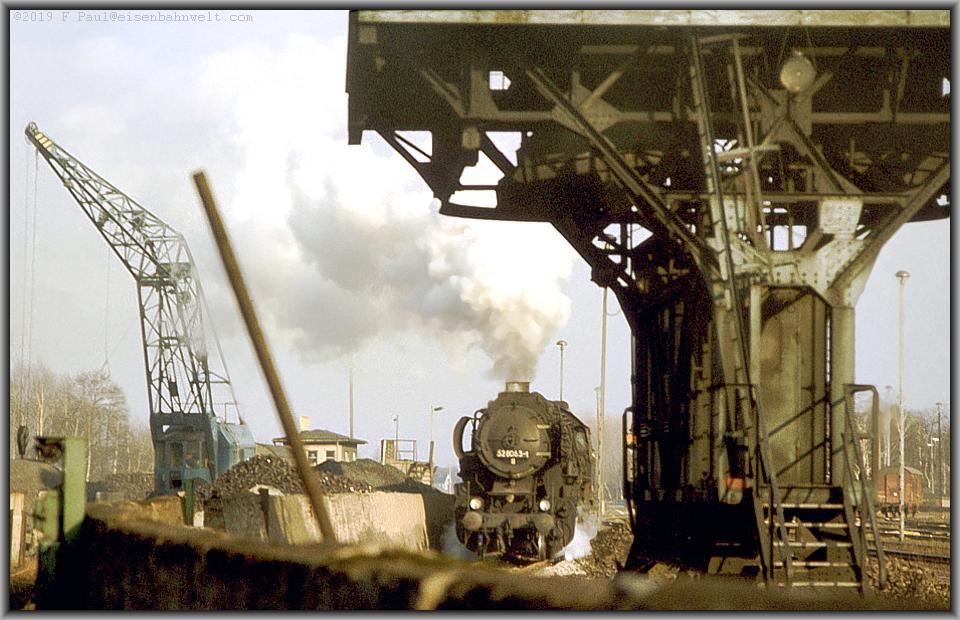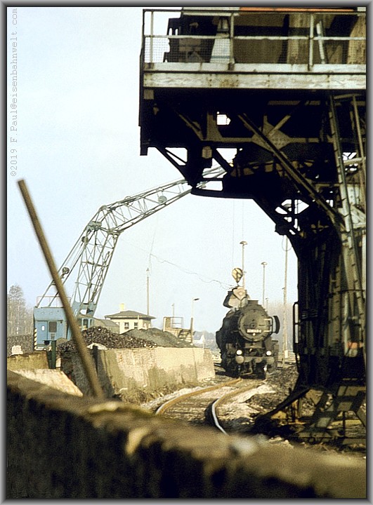Der Greifer öffnet sich und der Brennstoff poltert in den Tender. Immerhin wurde das eine Gleis unter dem Hochbunker hindurch noch einmal repariert, das zweite (rechts davon)
