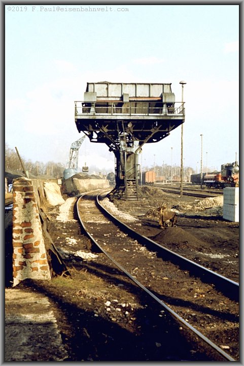 die Kohle in die Tender dosiert. Und das auf zwei Gleisen! Das rechte davon ist allerdings schon längst abgebaut, dieses kommt ja auch nicht am Kohlenbansen vorbei. Und es scheint so,