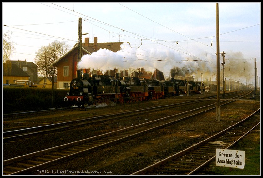 93 230, 92 503 und 91 134, gefolgt von der arbeitenden 95 027, von der kalten 78 009 und am Schluß der Bulle 95 6676, ebenfalls kalt. Im Blockabstand röhrt danach