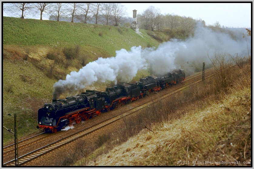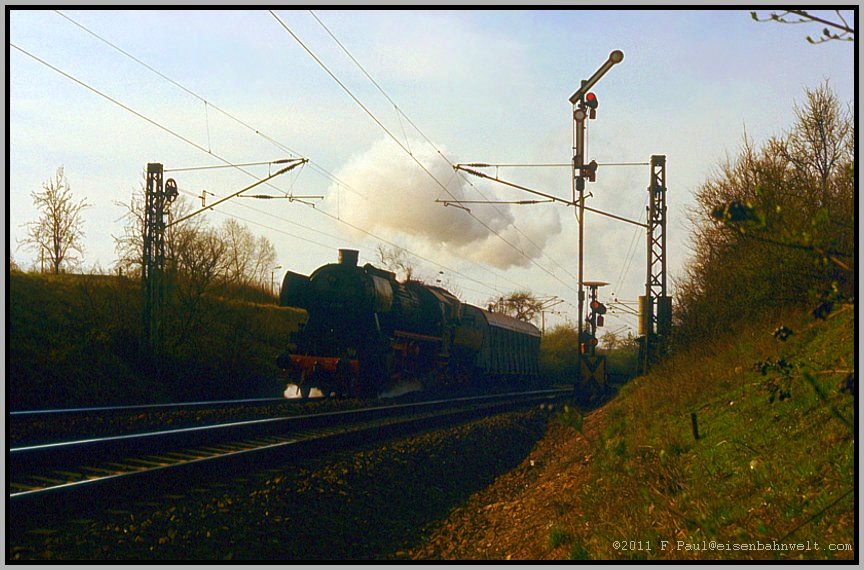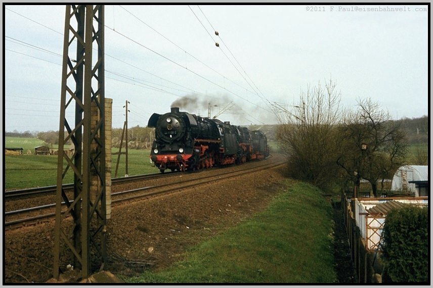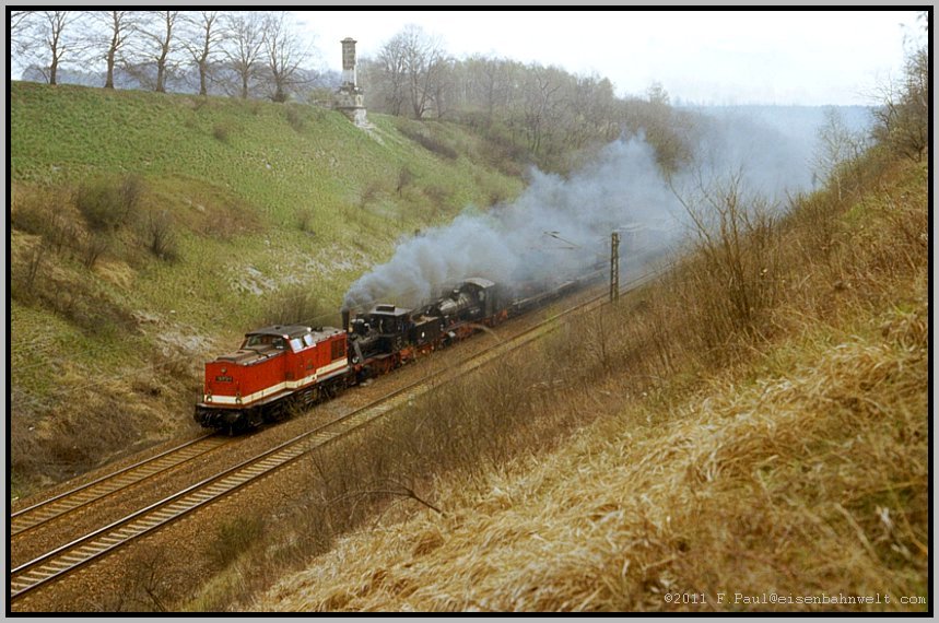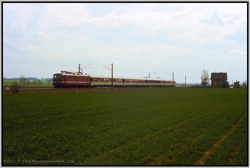entstanden: Eine unerkannt gebliebene 120'er mit ihrem Güterzug brummt in Richtung Falkenberg vorbei, gefolgt von D 872 mit 243 115 und 243 352. Am schönsten ist allerdings