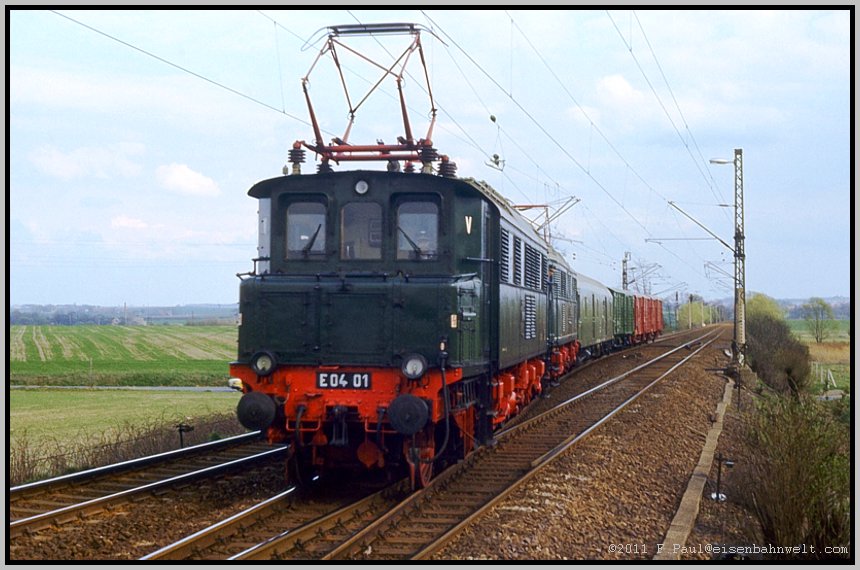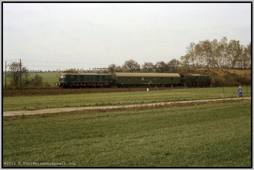 ich habe inzwischen einen Acker etwas weiter weg erreicht, wird es elektrisch: E18 31 und E04 01 rollen mit einem Postwagen im Schlepp vorbei, 93362 kommt von Leipzig Hbf und will