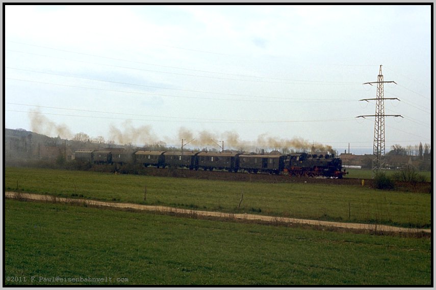 am Haken die kalten 19 017, 58 261 sowie 94 2105. Aber ein preußischer "Schnellzug" folgt auf dem Fuße: 93306 mit 38 1182, der kalten 17 1055 sowie zwei Schnellzugwagen.
