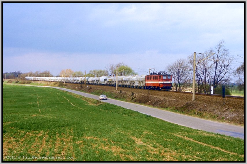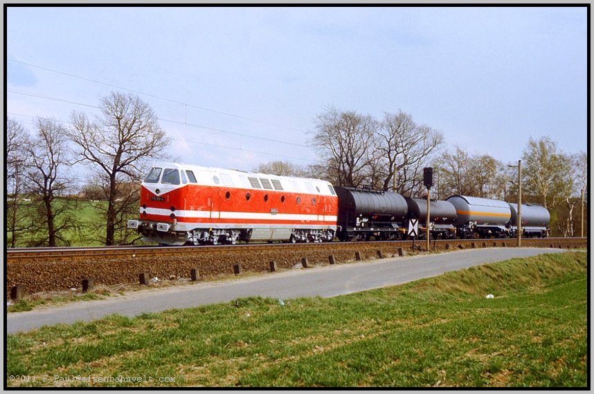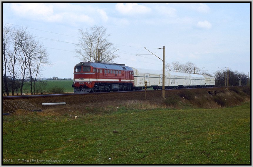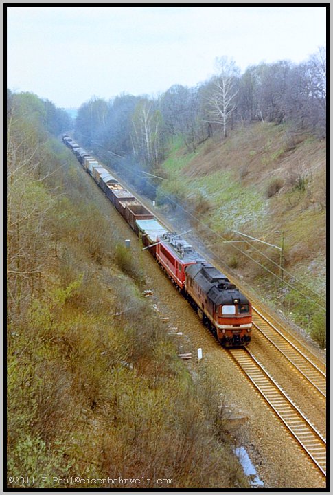 vom Kraftwerk Jänschwalde. Am 07.04. befördert eine unerkannt gebliebene 132'er insgesamt 6 Doppelstock-Einzelwagen. Immerhin ist diese Wagengattung der Vorläufer der mit der