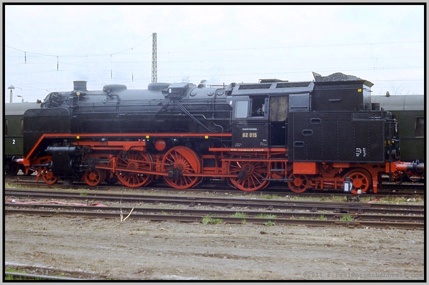 Später umrunde ich die schon mit Zügen vollgestellte Abstellanlage von Priestewitz. Ein Bild von der hochrädrigen 62 015 hat eigentlich immer seine Reize, auch ein Blick auf den gesamten