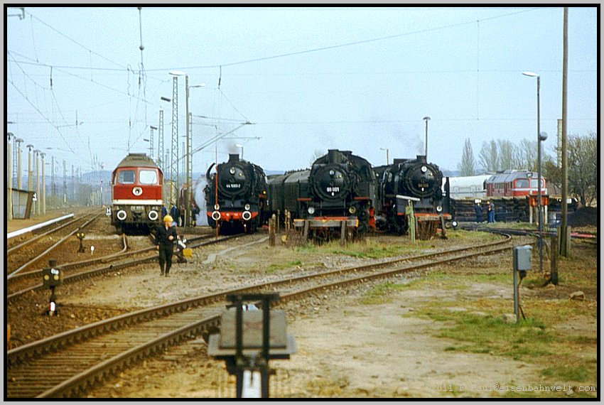 auf seinen Einsatz am nächsten Tag wartenden Sdz 93312 ist möglich: 62 015, 24 004, 64 007, 86 049 und 80 023 stehen hintereinander. Und: Auch im Jahr 1989 wird schon die Feuerwehr zur Wasserversorgung der Dampfloks