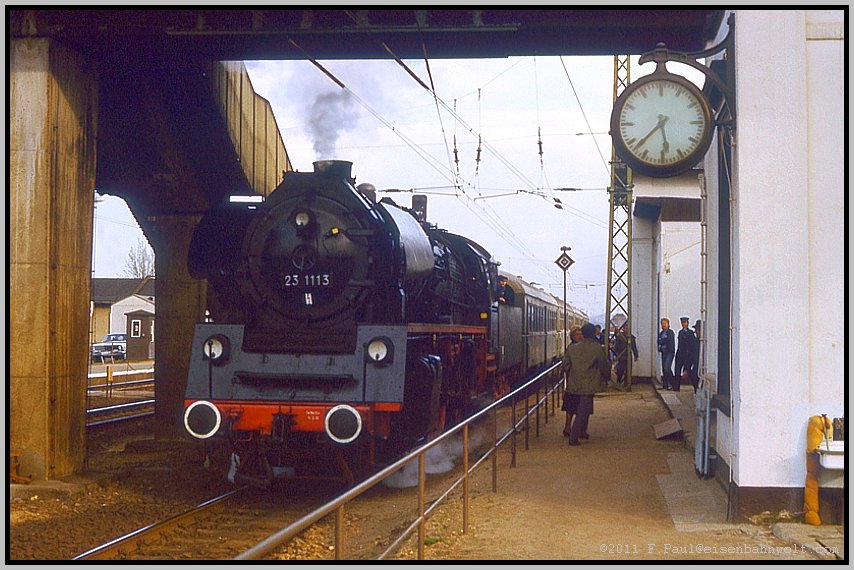 86 001 und 62 015. Und ganz rechts, hinter dem provisorischen Kohlenbansen, übernachtet 120 343 mit ihren Kühlwagen. Noch rechtzeitig für eine Fotoserie rollt später 23 1113 mit einer Reihe E5-Wagen ins Überholgleis, sie