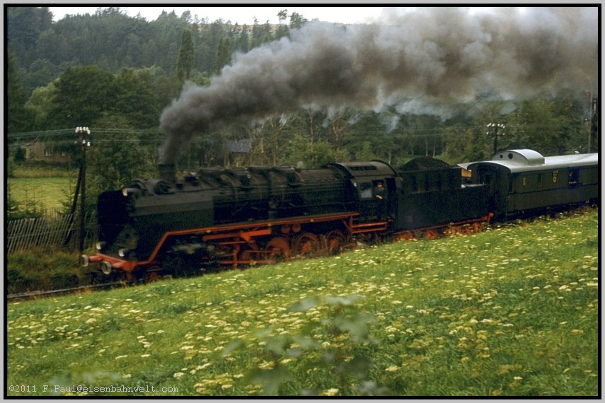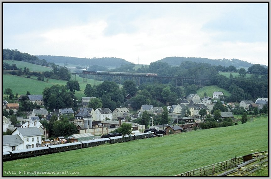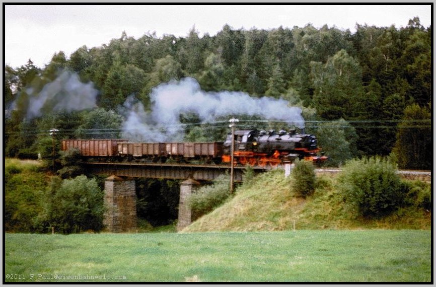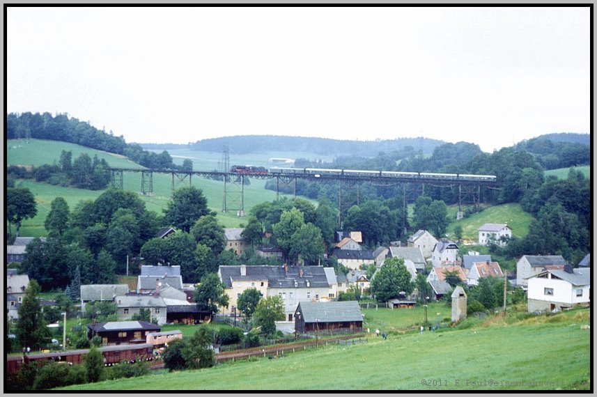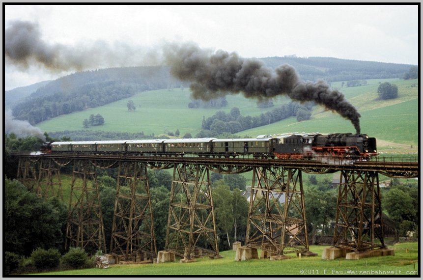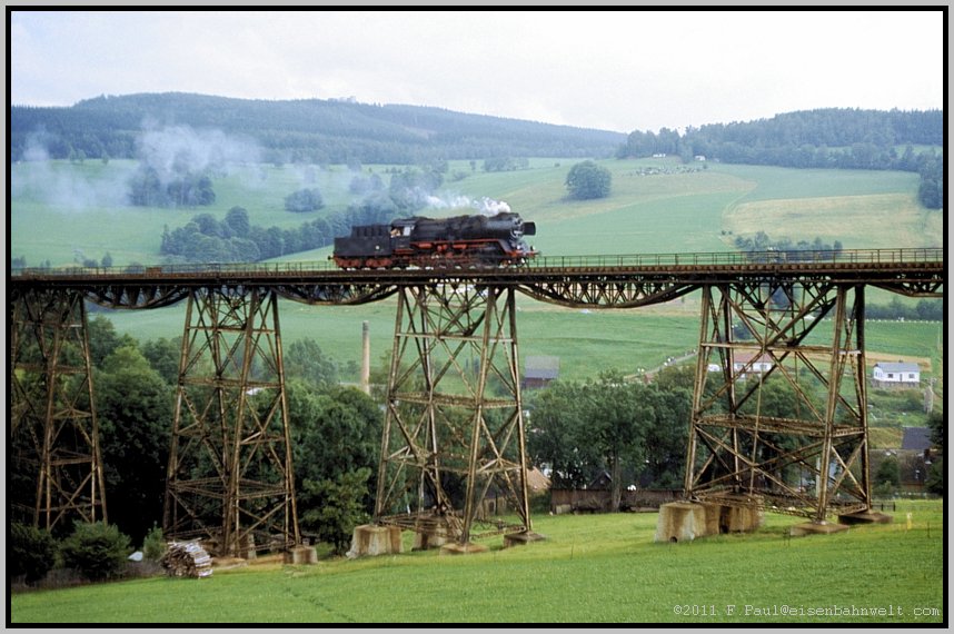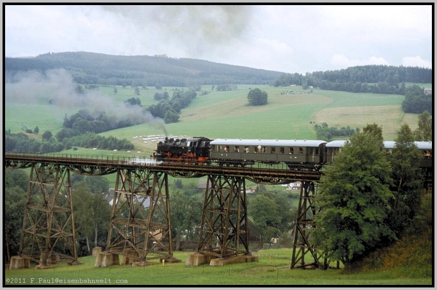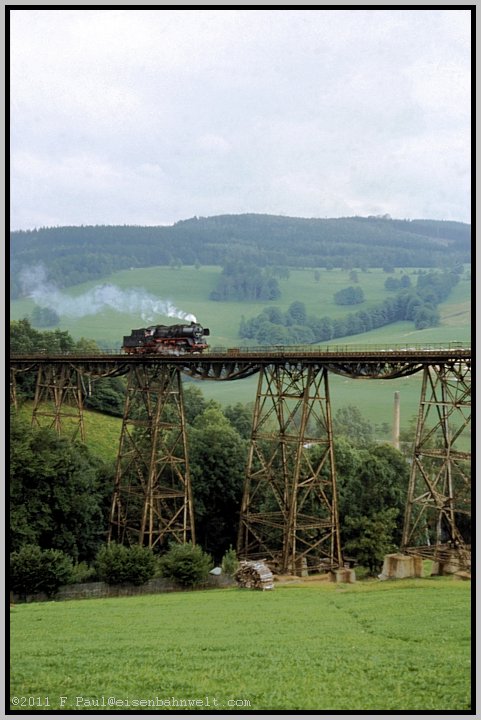 Bald darauf verläßt 50 849 den Bahnhof und donnert den Berg nach Scheibenberg hinauf, poltert über den Markersbacher Viadukt, um kurz darauf hinter den Bergeshöhen