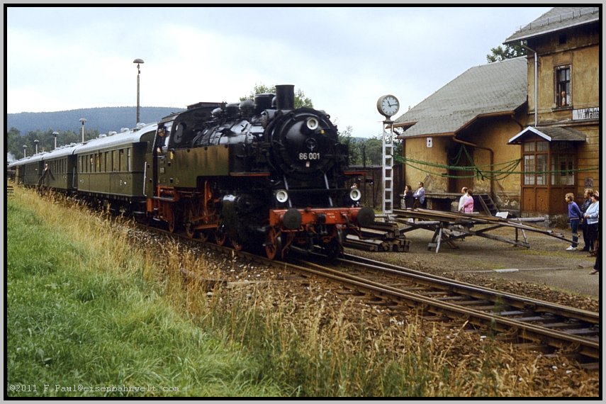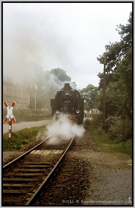 Zu lang ist der Zug für den Endbahnhof der Strecke, schnell kehrt er zurück, diesmal windet sich wiederum 86 001 an seiner Spitze durch die Häuser des Ortes und etwas später