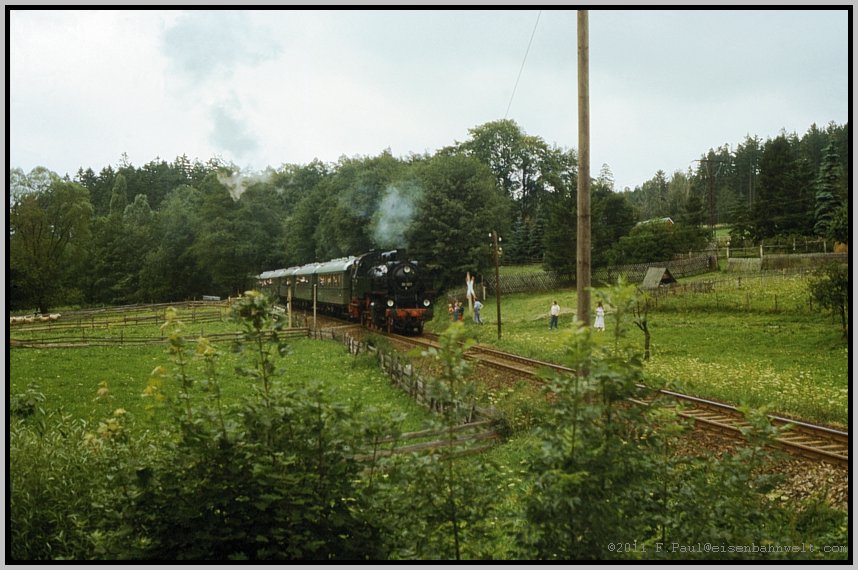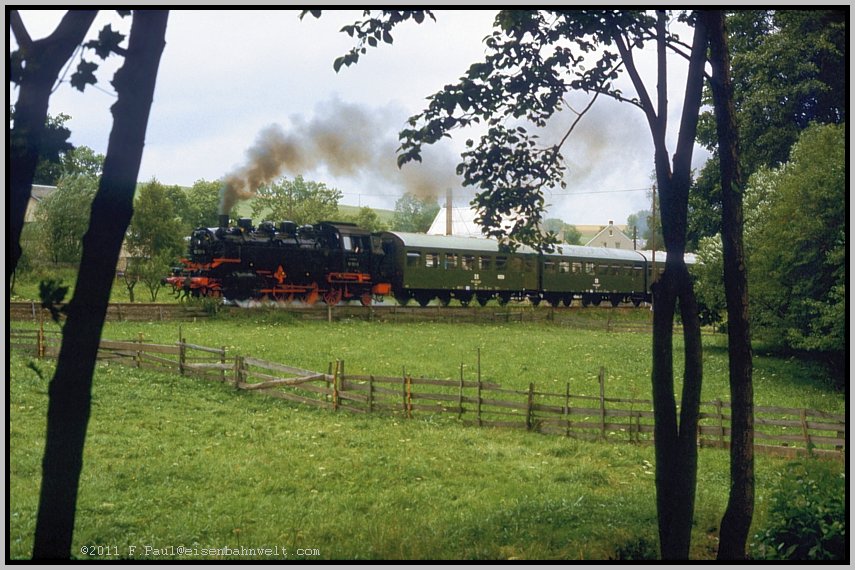 Und nochmals rollt der Zug an uns vorbei: In der Senke des Zschopautals zwischen Schlettau und Waltersdorf ein wenig wegen der Rechtskurve qietschend,