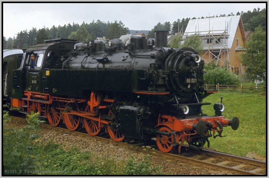 Und dann kommt er! Mit Volldampf bullern 86 001 und 86 1501 die Steigung aus dem Sehmatal hinauf. Unmöglich ist es, alle auf Fotos erpichten