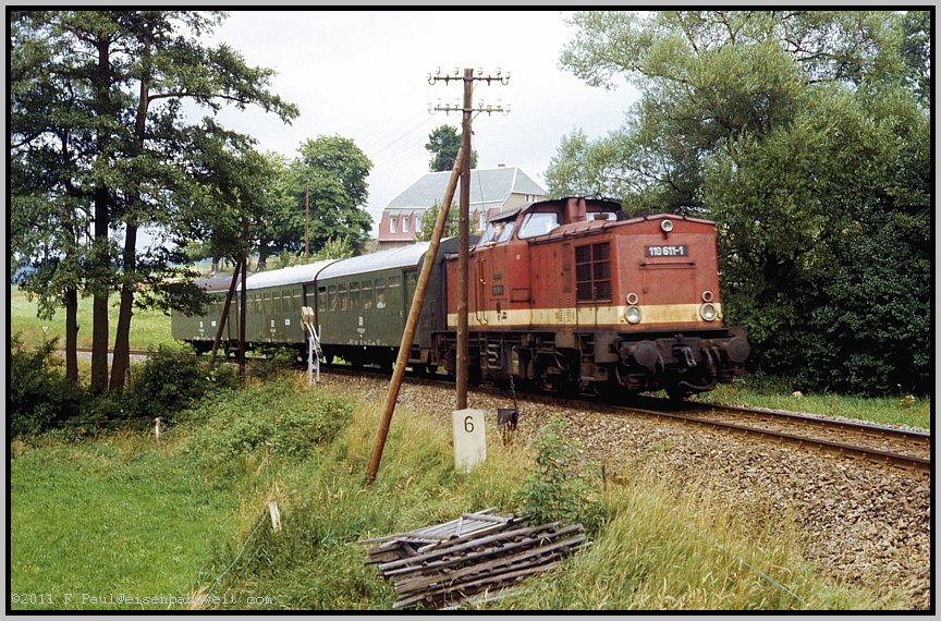 der Strrecke nach Crottendorf übernehmen. Zuerst jedoch kommt der Mittagspersonenzug nach Annaberg, P 16653 vorbei. 110 611 zieht drei Donnerbüchsen hinter sich her. Wesentlich