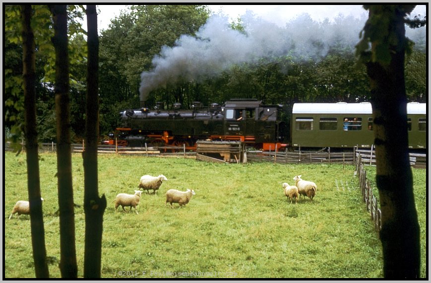 Zum Glück ist der Zug nicht schnell und auf der Wiese zwischen Waltersdorf und Crottendorf schon wieder überholt. Die Schafe wundern sich wohl ein wenig über die
