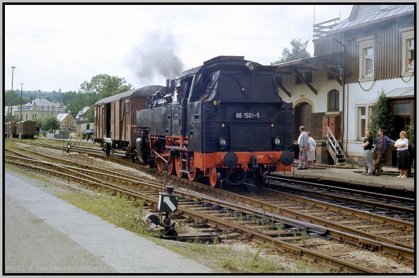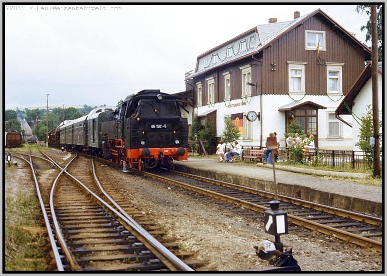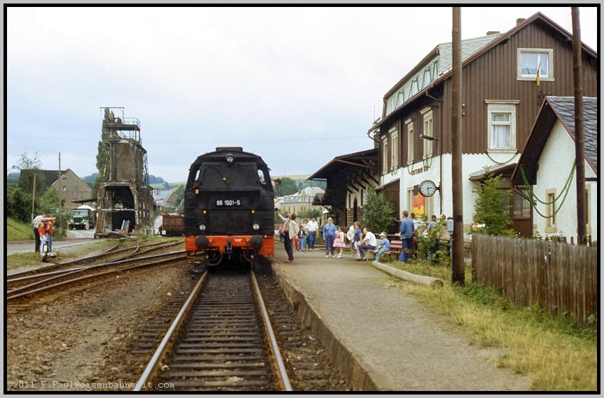 Eigentlich müßte ja P 16671 aus Schwarzenberg zuerst in Waltersdorf eintreffen, der scheint aber Verspätung zu haben. Dafür rollt 86 1501 mit P 19647 in das