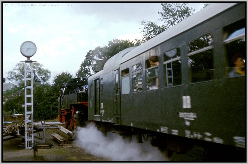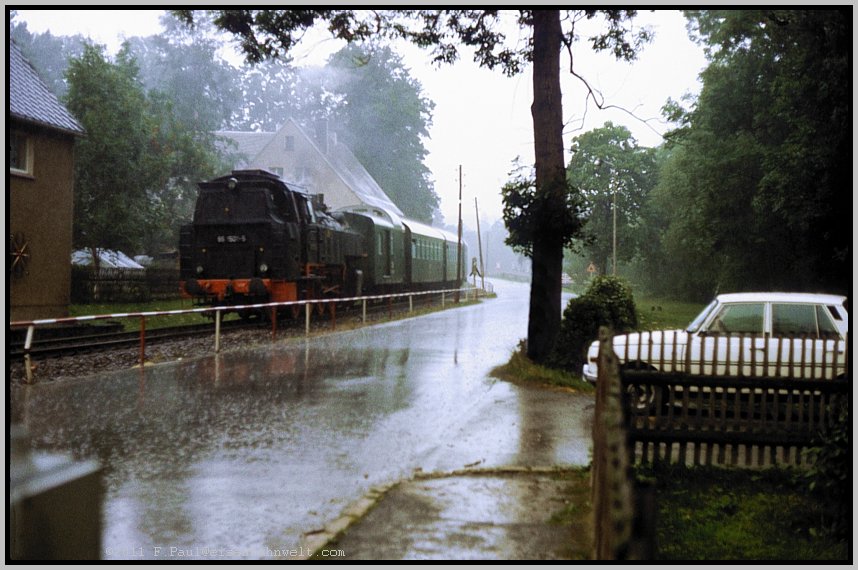 Auch eine DDR-Fahne darf aus diesem Anlaß nicht fehlen! Als der Zug dann durch den Ort fährt, öffnet der Himmel seine Schleusen. Ein mächtiges Gewitter tobt sich über dem Ort aus.