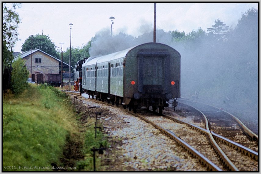 In Markersbach ist alles trocken. Ein kurzer Blick auf den Bahnhof vom Bahnübergang aus: Am Schluß des Sonderzuges schmaucht 86 001,