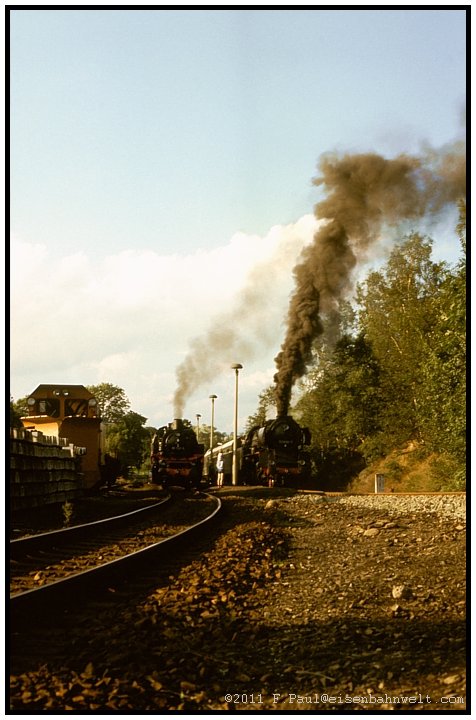Crottendorfer Gleis. Und - er wartet den Anschluß ab! Und - eine weitere Überraschung: Zuglok beim später dann eintreffenden P 16671 ist 50 3696! So stehen beide Loks kurze Zeit