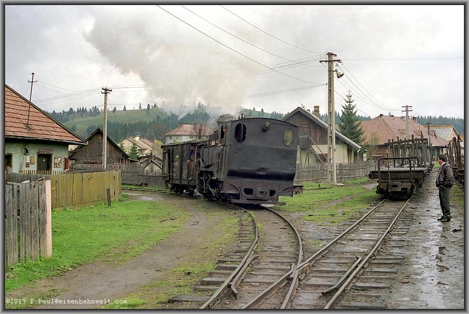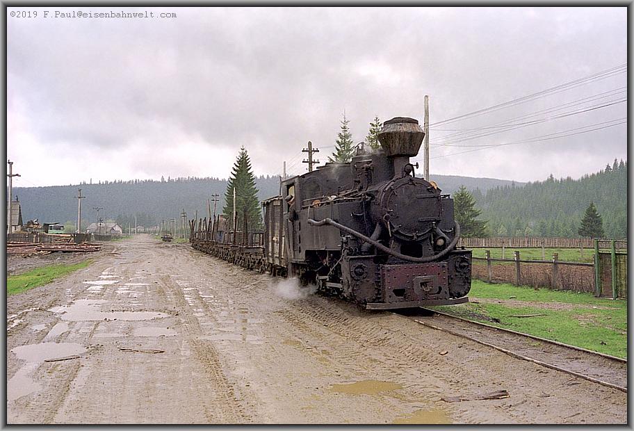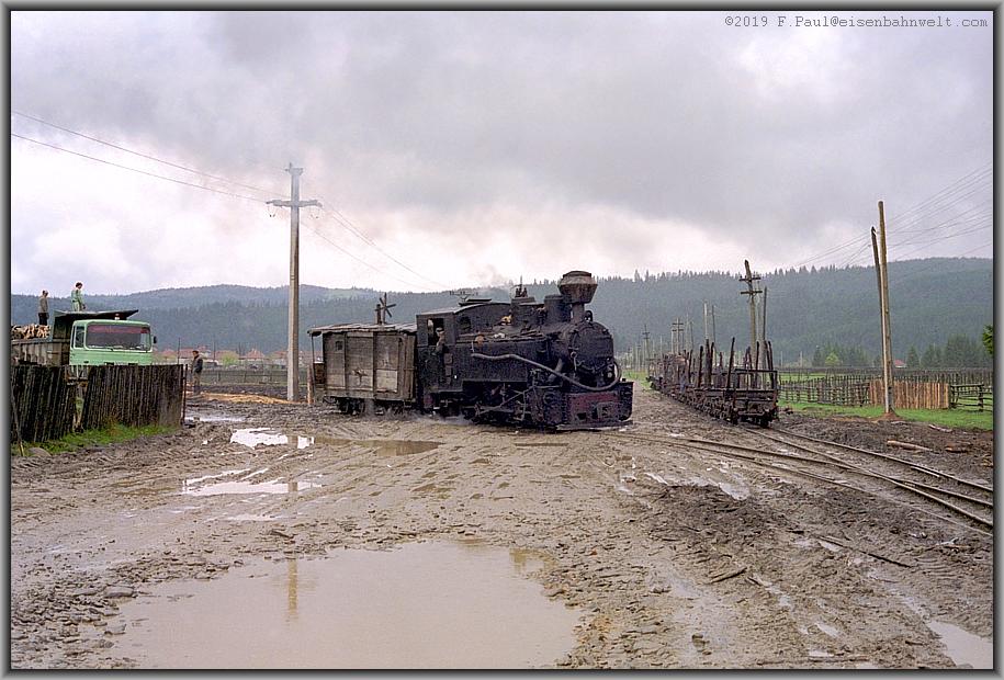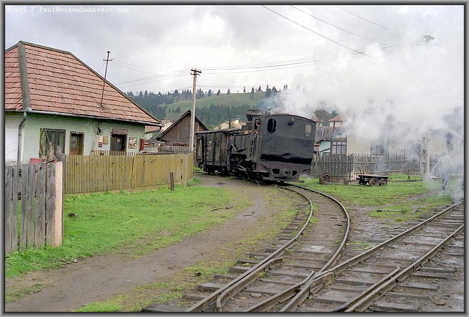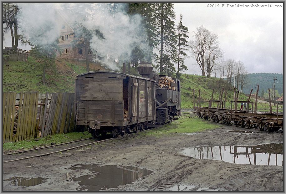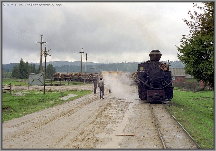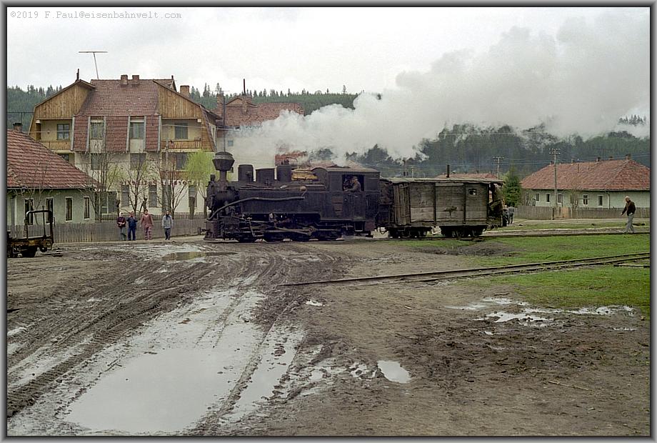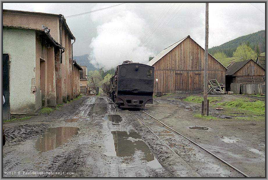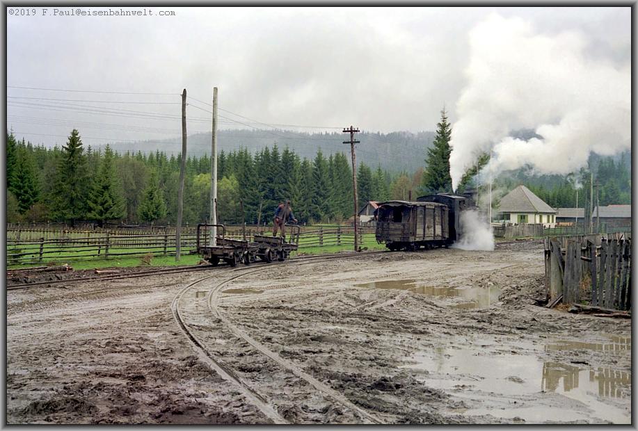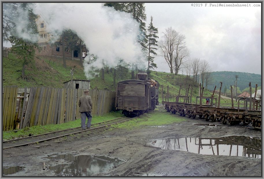 für uns, wir warten auf den von der ersten Fahrt aus Siclau zurückkehrenden Dampfzug. Und da schwankt sie auch schon auf dem ausgeleierten Streckengleis entlang des schlammigen Fahrweges heran,