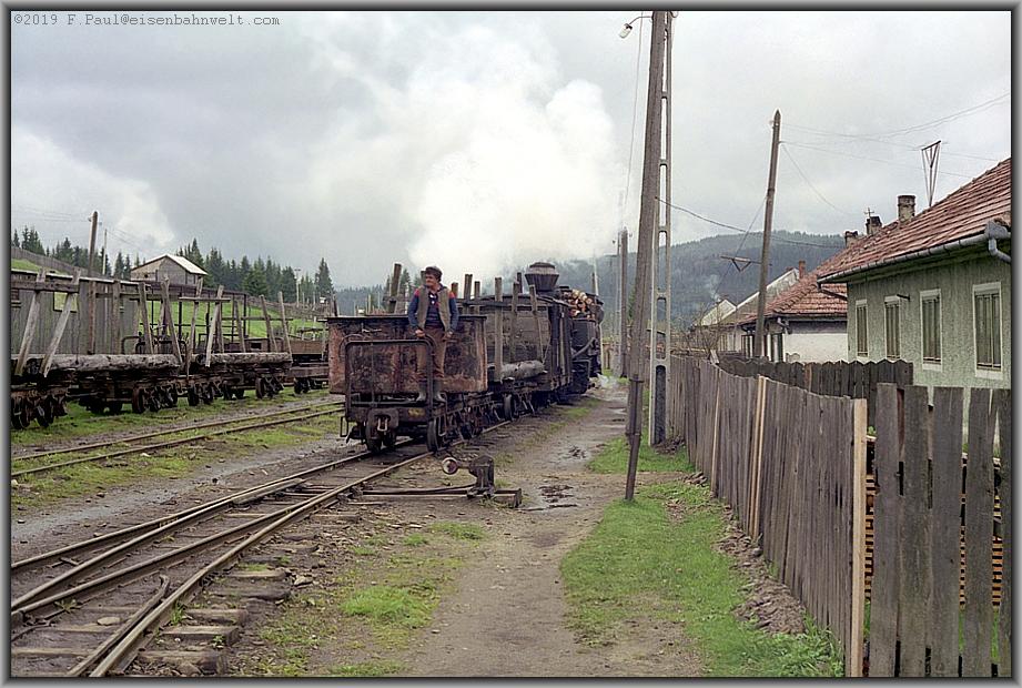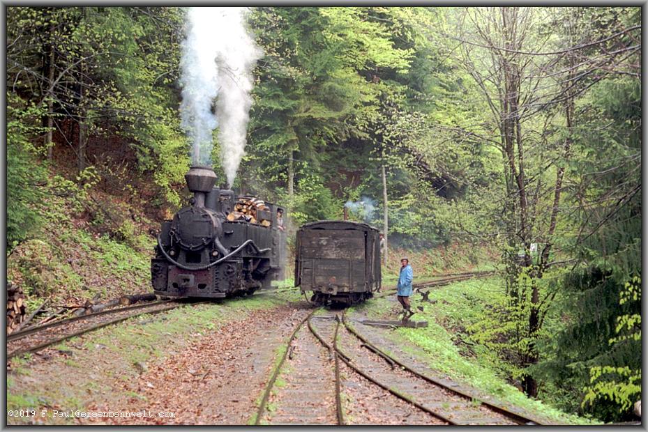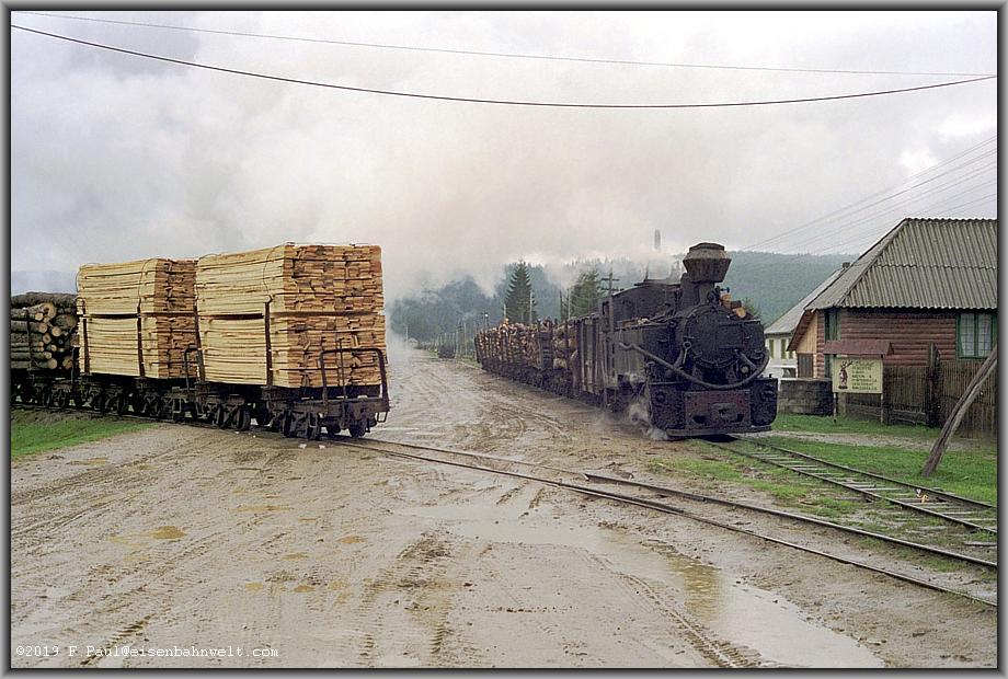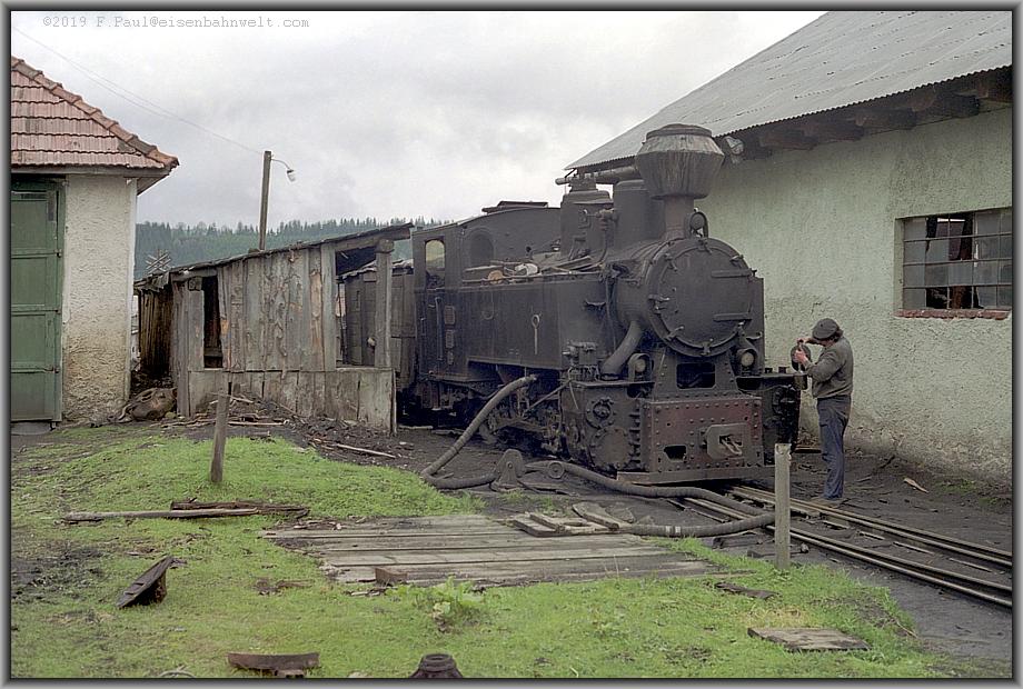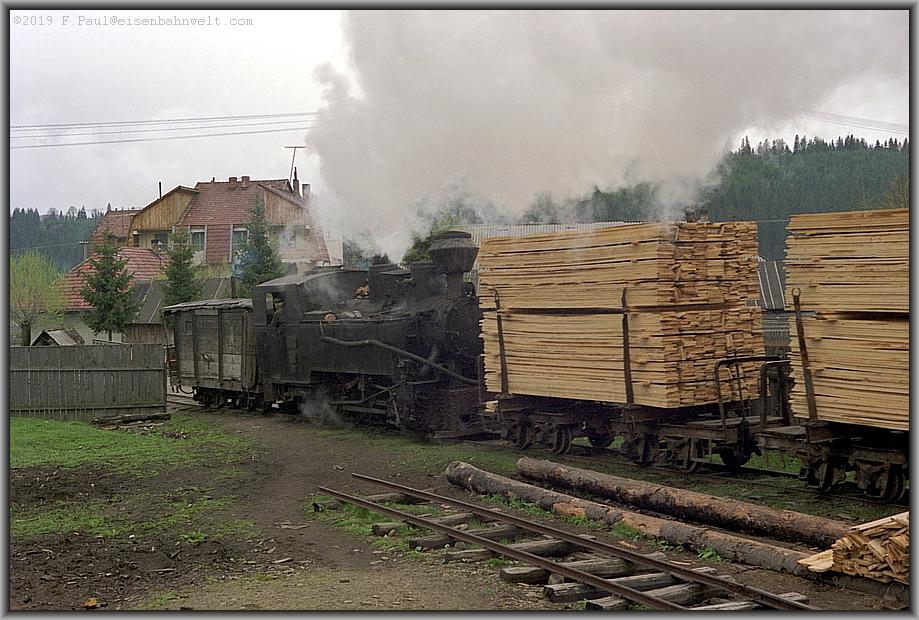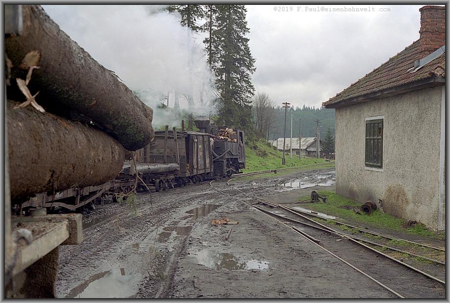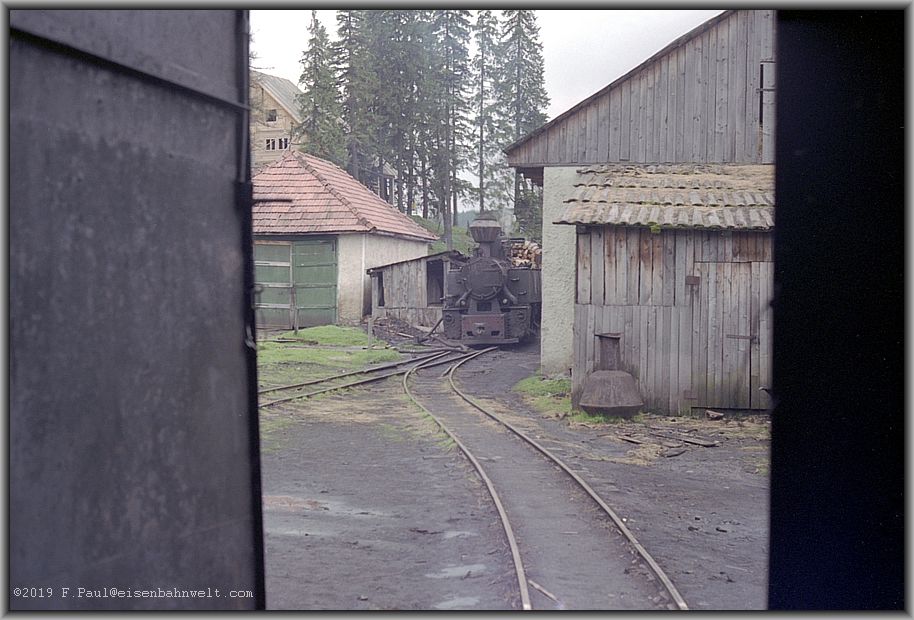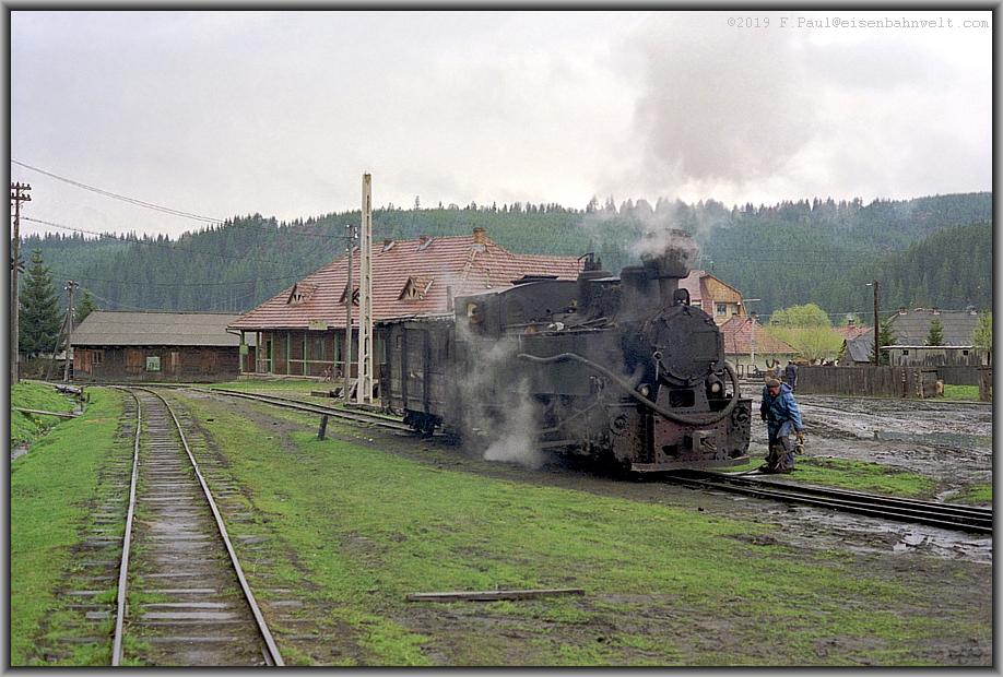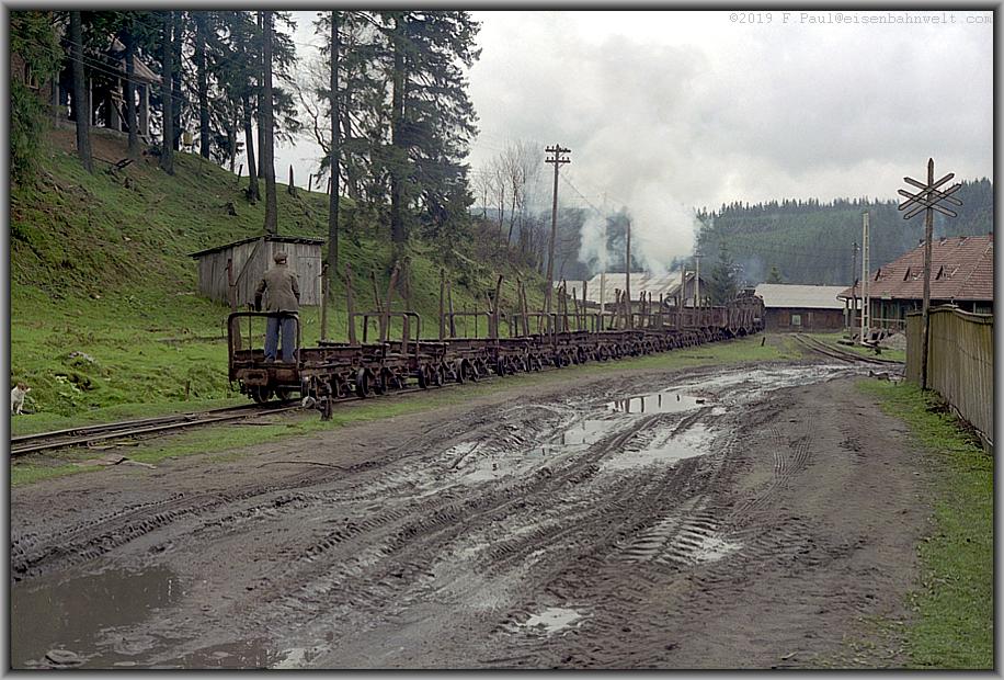 für uns, wir warten auf den von der ersten Fahrt aus Siclau zurückkehrenden Dampfzug. Und da schwankt sie auch schon auf dem ausgeleierten Streckengleis entlang des schlammigen Fahrweges heran,